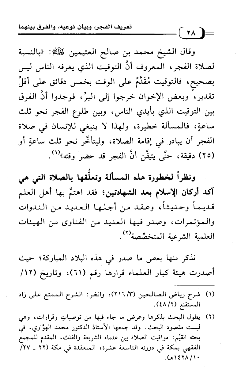 وقال الشيخ محمد بن صالح العثيمين رحمه الله: بالنسبة لصلاة الفجر، المعروف أن التوقيت الذي يعرفه الناس ليس بصحيح، فالتوقيت مقدم على الوقت بخمس دقائق على أقل تقدير، وبعض الإخوان خرجوا إلى البر، فوجدوا أن الفرق بين التوقيت الذي بأيدي الناس، وبين طلوع الفجر نحو ثلث ساعة فالمسألة خطيرة، ولهذا لا ينبغي للإنسان في صلاة الفجر أن يبادر في إقامة الصلاة، وليتأخر نحو ثلث ساعة أو (25) دقيقة، حتى يتيقن أن الفجر قد حضر وقته (¬1).