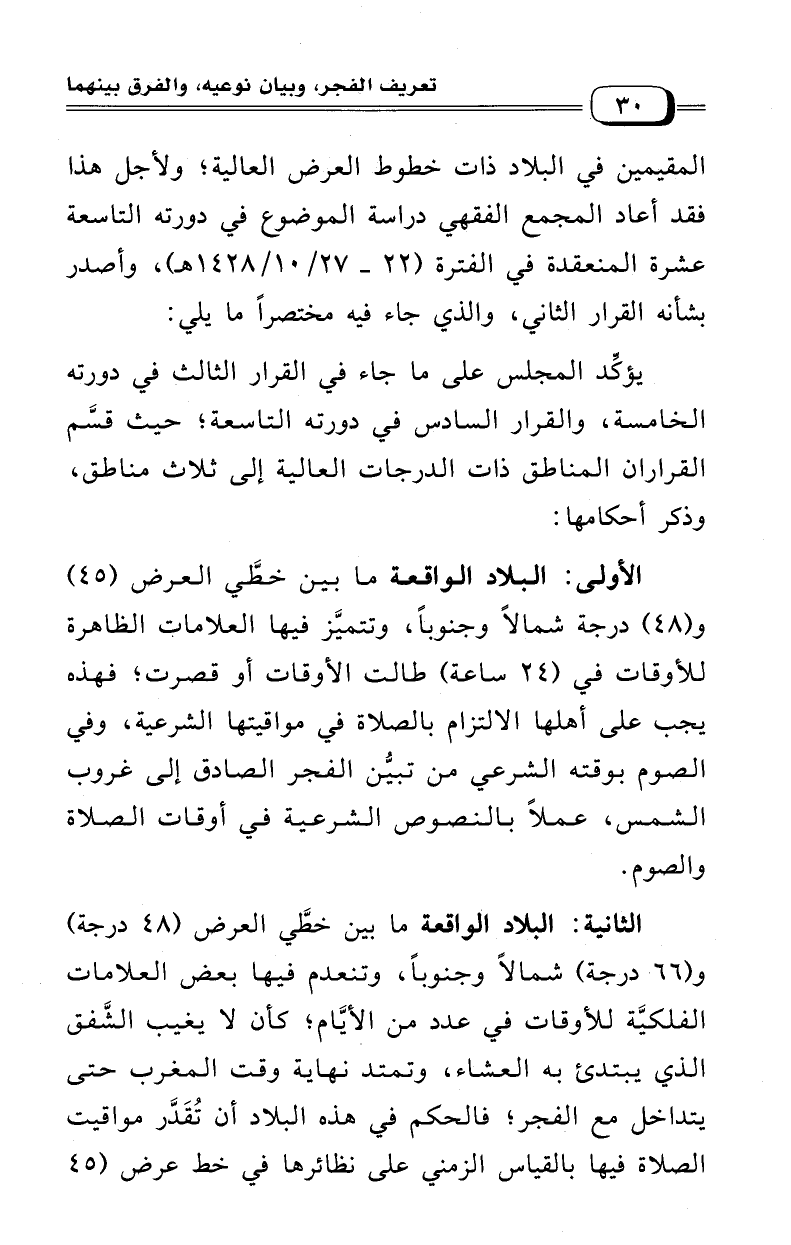 الأولى: البلاد الواقعة: ما بين خطي العرض (45) و (48) درجة شمالاً وجنوبًا، وتتميز فيها العلامات الظاهرة للأوقات في (24 ساعة) طالت الأوقات أو قصرت؛ فهذه يجب على أهلها الالتزام بالصلاة في مواقيتها الشرعية، وفي الصوم بوقته الشرعي من تبين الفجر الصادق إلى غروب الشمس، عملاً بالنصوص الشرعية في أوقات الصلاة والصوم.
