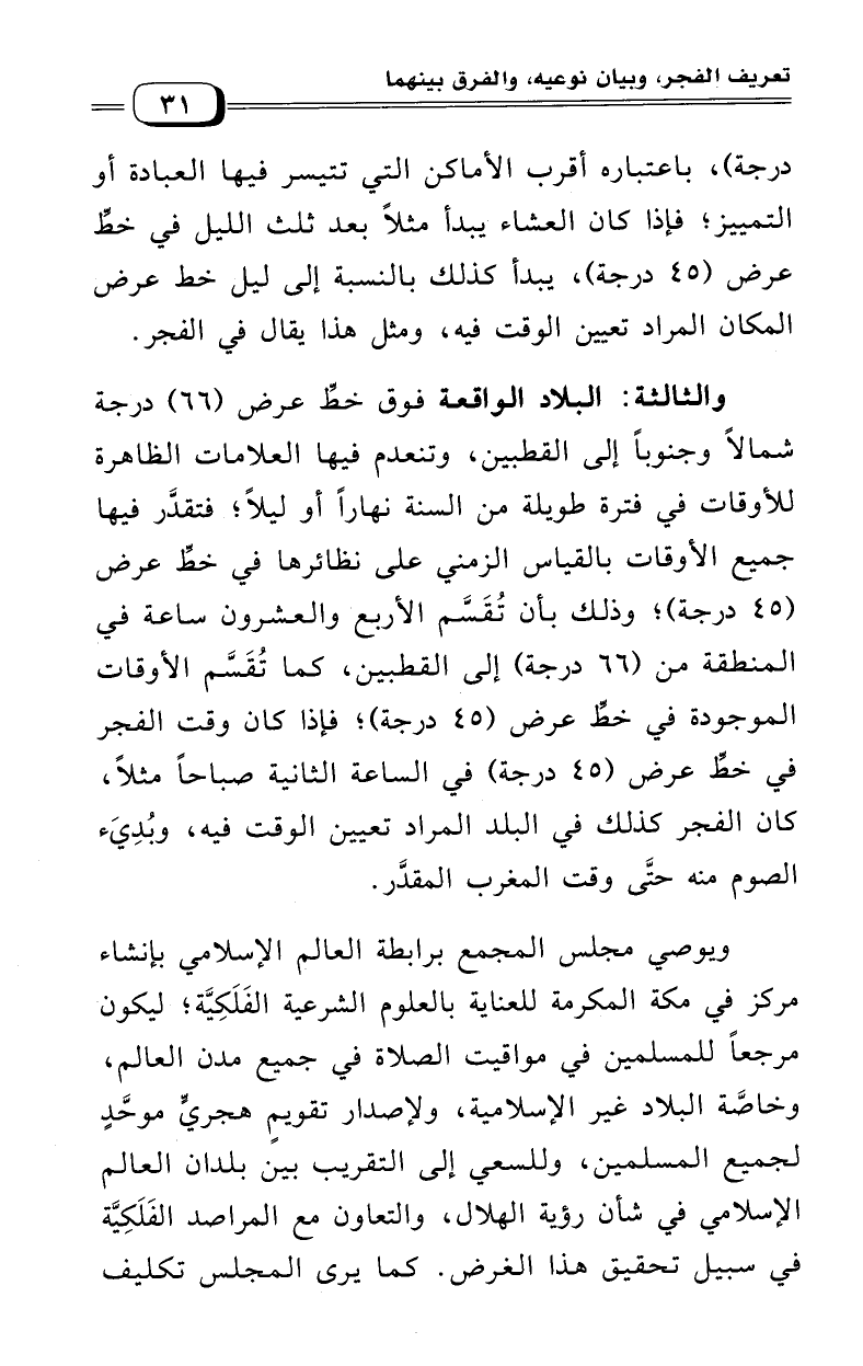 درجة) باعتباره أقرب الأماكن التي تتيسر فيها العبادة أو التمييز؛ فإذا كان العشاء يبدأ مثلاً بعد ثلث الليل في خط عرض (45 درجة) يبدأ كذلك بالنسبة إلى ليل خط عرض المكان المراد تعيين الوقت فيه، ومثل هذا يقال في الفجر.