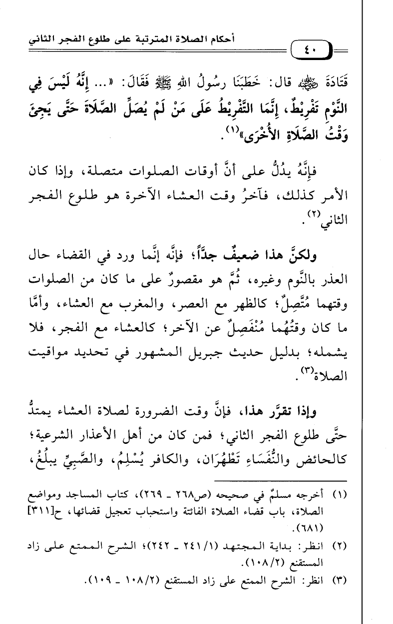 قتادة رضي الله عنه قال: خطبنا رسول الله - صلى الله عليه وسلم - فقال: «.. إنه ليس في النوم تفريط، إنما التفريط على من لم يصل الصلاة حتى يجيء وقت الصلاة الأخرى» (¬1).