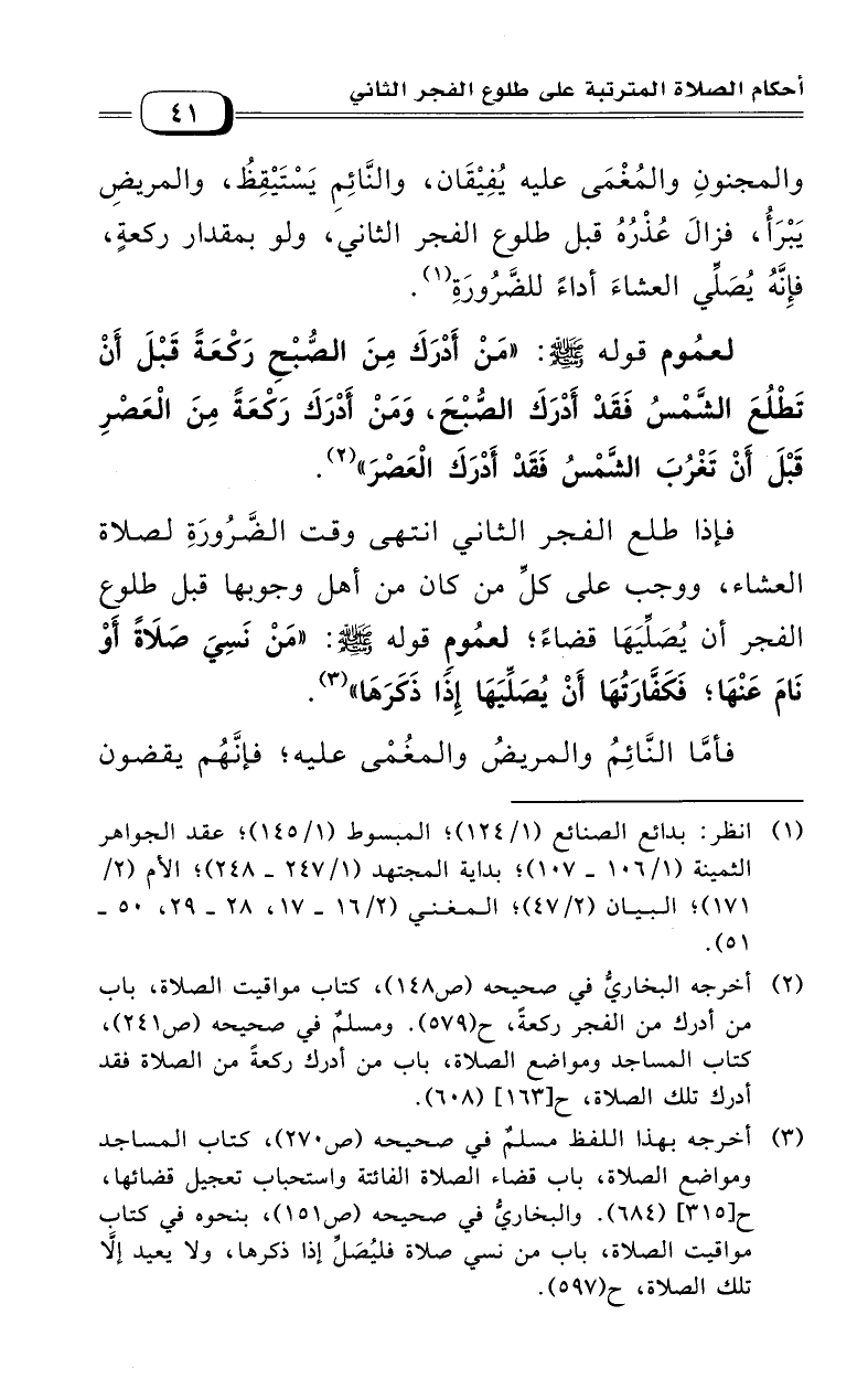 (¬2) أخرجه البخاري في صحيحه (148) كتاب مواقيت الصلاة، باب من أدرك من الفجر ركعة، (579) ومسلم في صحيحه (241) كتاب المساجد ومواضع الصلاة باب من أدرك ركعة من الصلاة فقد أدرك تلك الصلاة (163) (608).