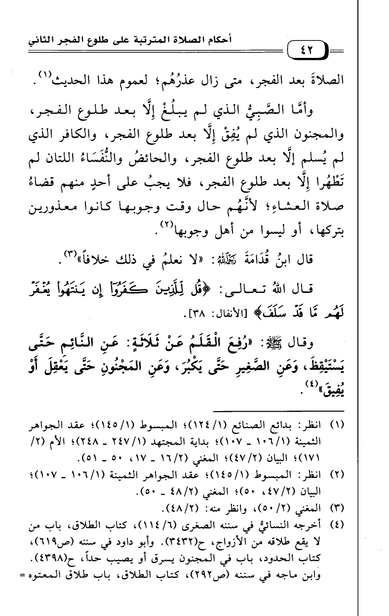 (¬4) أخرجه النسائي في سننه الصغرى (6/ 114) كتاب الطلاق باب من لا يقع طلاقه من الأزواج (3432) وأبو داود في سننه (619) كتاب الحدود، باب في المجنون يسرق أو يصيب حدًا (4398) وابن ماجة في سننه (292) كتاب الطلاق، باب طلاق المعتوه والصغير والنائم (2041).