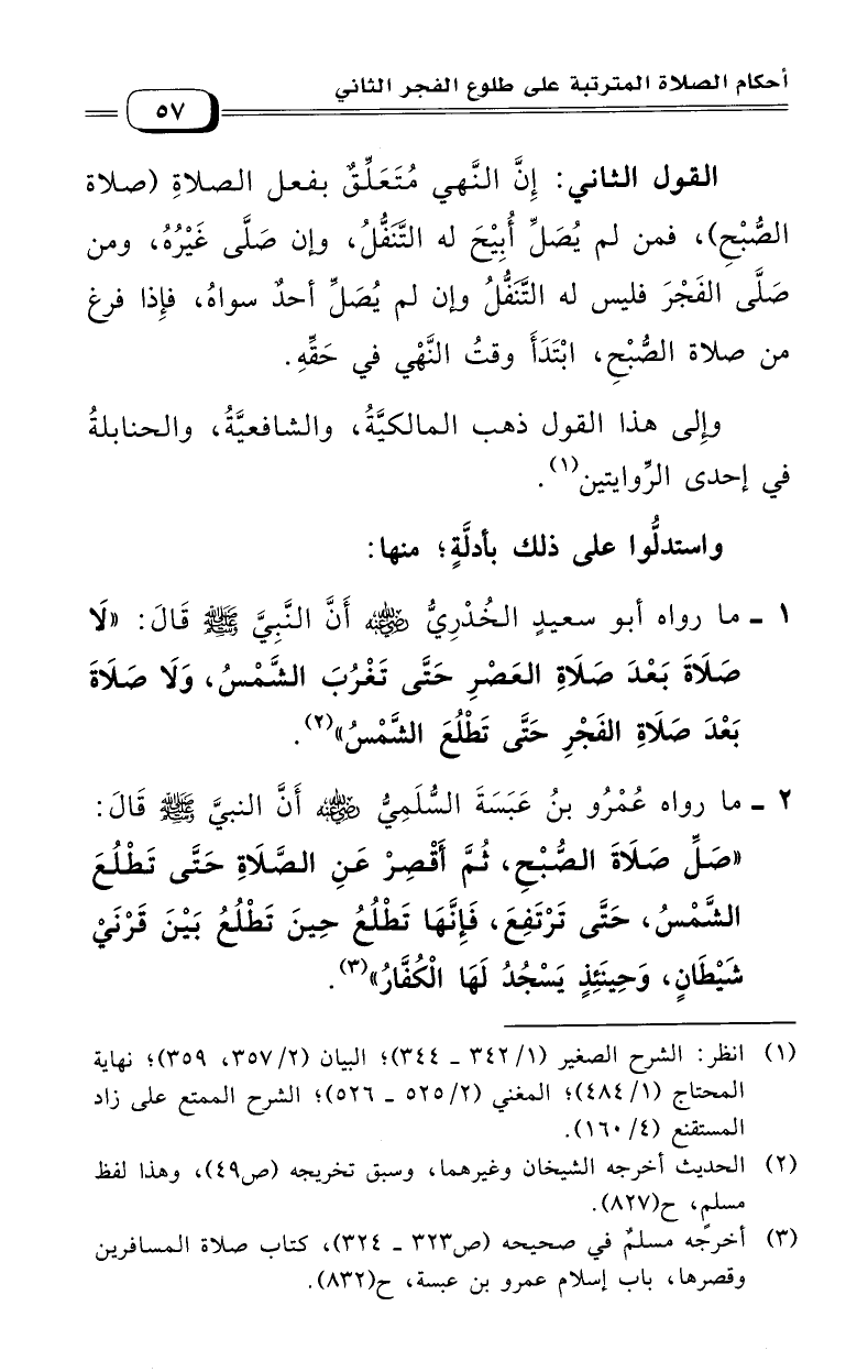 القول الثاني: إن النهي متعلق بفعل الصلاة (صلاة الصبح) فمن لم يصل أبيح له التنفل وإن صلى غيره، ومن صلى الفجر فليس له التنفل وإن لم يصل أحد سواه، فإذا فرغ من صلاة الصبح، ابتدأ وقت النهي في حقه.