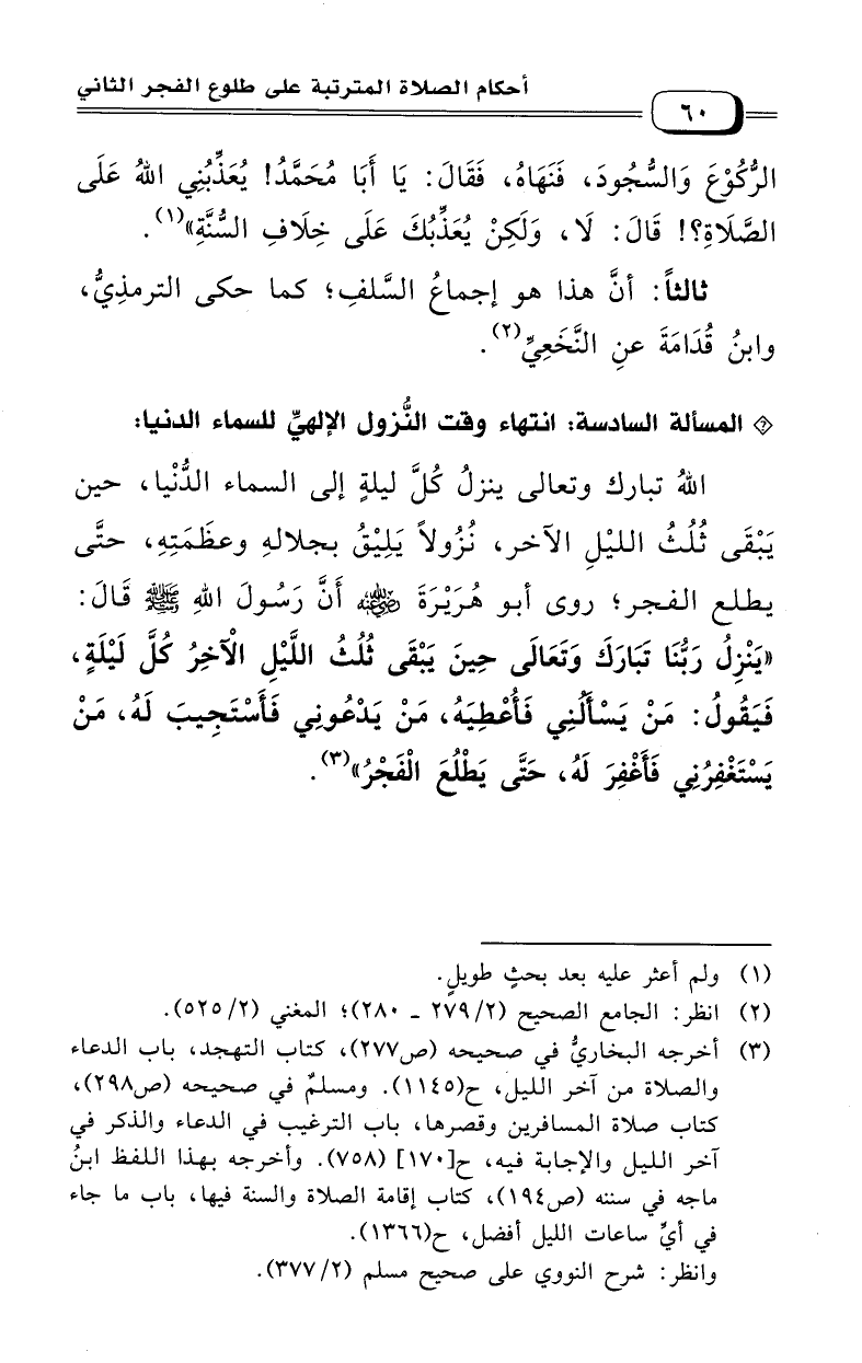 (¬3) أخرجه البخاري في صحيحه (277) كتاب التهجد باب الدعاء والصالة من آخر الليل، (1145) ومسلم في صحيحه (298) كتاب صلاة المسافرين وقصرها، باب الترغيب في الدعاء والذكر في آخر الليل والإجابة فيه (170، 758) وأخرجه بهذا اللفظ ابن ماجه في سننه (194) كتاب إقامة الصلاة والسنة فيها، باب ما جاء في أي ساعات الليل أفضل (1366).