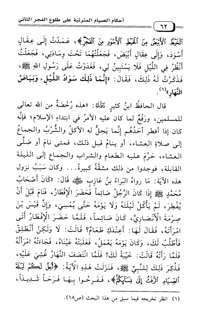 الْخَيْطُ الْأَبْيَضُ مِنَ الْخَيْطِ الْأَسْوَدِ مِنَ الْفَجْرِ} عمدت إلى عقال أسود، وإلى عقال أبيض فجعلتهما تحت وسادتي فجعلت أنظر في الليل فلا يستبين لي، فغدوت على رسول الله - صلى الله عليه وسلم - فذكرت له ذلك فقال: «إنما ذلك سواد الليل، وبياض النهار» (¬1).