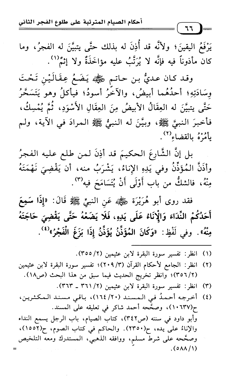 وقد كان عدي بن حاتم رضي الله عنه يضع عقالين تحت وسادته؛ أحدهما أبيض، والآخر أسود؛ فيأكل وهو يتسحر حتى يتبين له العقال الأبيض من العقال الأسود، ثم يمسك فأخبر النبي - صلى الله عليه وسلم - وبين له النبي - صلى الله عليه وسلم - المراد في الآية ولم يأمره بالقضاء (¬2).