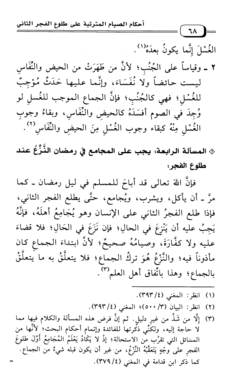 (¬3) إلا من شذ من غير دليل. ثم إن فرض هذه المسألة والكلام فيها مما لا حاجة إليه، ولكني ذكرتها للفائدة وإتمام أحكام البحث؛ لأنها من المسائل التي تقرب من الاستحالة؛ إذ لا يكاد يعلم المجامع أول طلوع الفجر على وجه يعقبه النزع، من غير أن يكون قبله شيء من الجماع كما ذكر ابن قدامة في المغني (4/ 379).
