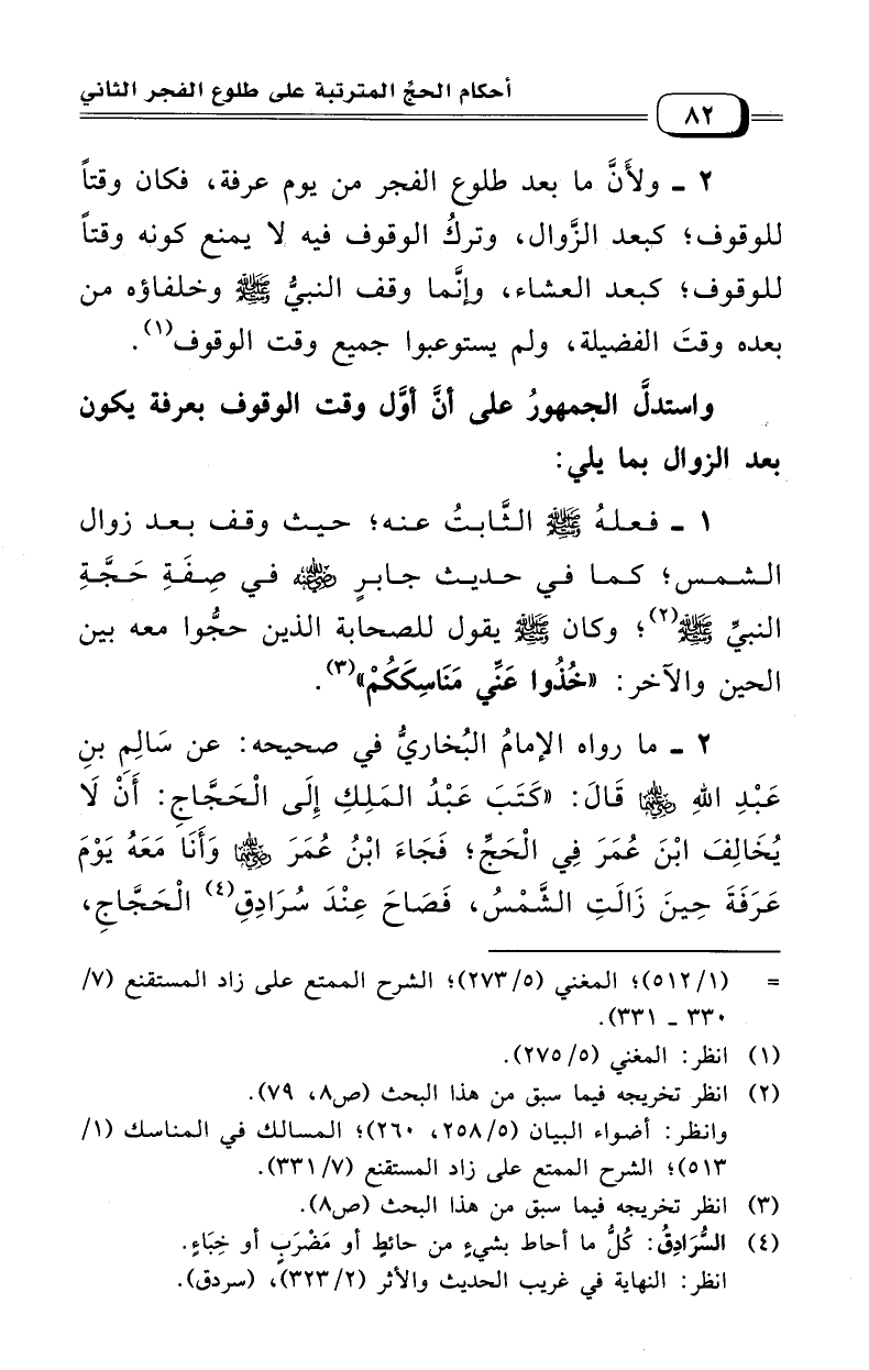 2 - ما رواه الإمام البخاري في صحيحه: عن سالم بن عبد الله رضي الله عنهما قال: "كتب عبد الملك إلى الحجاج: أن لا يخالف ابن عمر في الحج؛ فجاء ابن عمر رضي الله عنهما وأنا معه يوم عرفة حين زالت الشمس، فصاح عند سرادق (¬4) الحجاج،