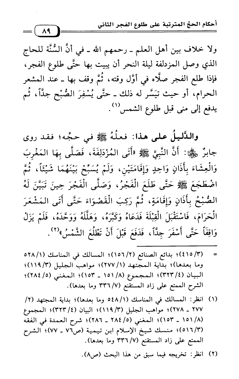 (¬1) انظر: المسالك في المناسك (1/ 548) وما بعدها بداية المجتهد (2/ 277، 278) مواهب الجليل (3/ 119) البيان (4/ 323) المجموع (8/ 151 - 153) المغني (5/ 284 - 286) شرح العمدة في الفقه (3/ 516) منسك شيخ الإسلام ابن تيمية (76، 77) الشرح الممتع على زاد المستقنع (7/ 336) وما بعدها.