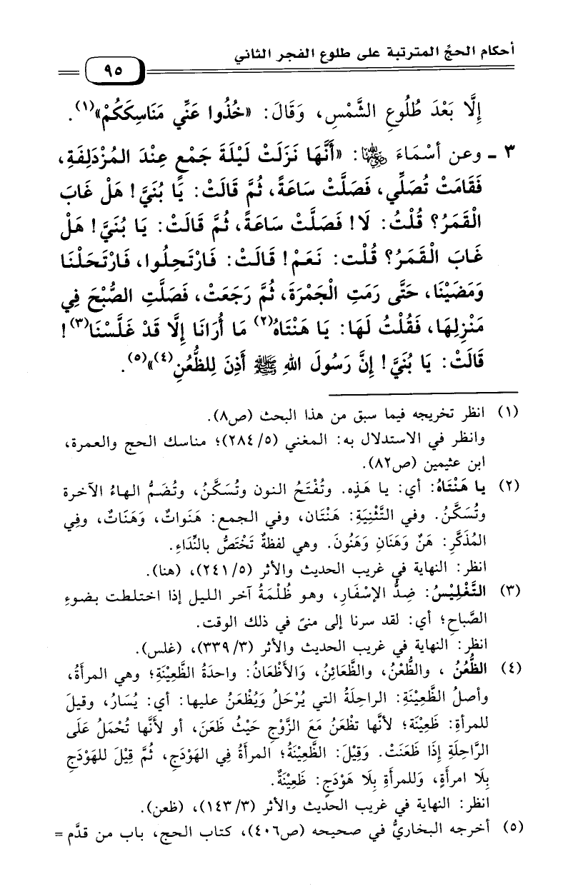 (¬5) أخرجه البخاري في صحيحه (406) كتاب الحج باب من قدم ضعفة أهله بليل، فيقفون بالمزدلفة يدعون، ويقدم إذا غاب القمر، (1679) ومسلم في صحيحه (510) كتاب الحج باب استحباب تقديم دفع الضعفة من النساء وغيرهن من مزدلفة إلى منى في أواخر الليل قبل زحمة الناس (1291).