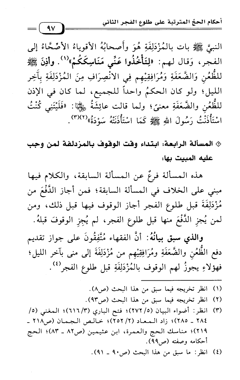 وأذن - صلى الله عليه وسلم - للظعن والضعفة ومرافقيهم في الانصراف من المزدلفة بآخر الليل؛ ولو كان الحكم واحدًا للجميع، لما كان في الإذن للظعن والضعفة معنى، ولما قالت عائشة رضي الله عنها: "فليتني كنت استأذنت رسول الله - صلى الله عليه وسلم - كما استأذنته سودة (¬2) (¬3).