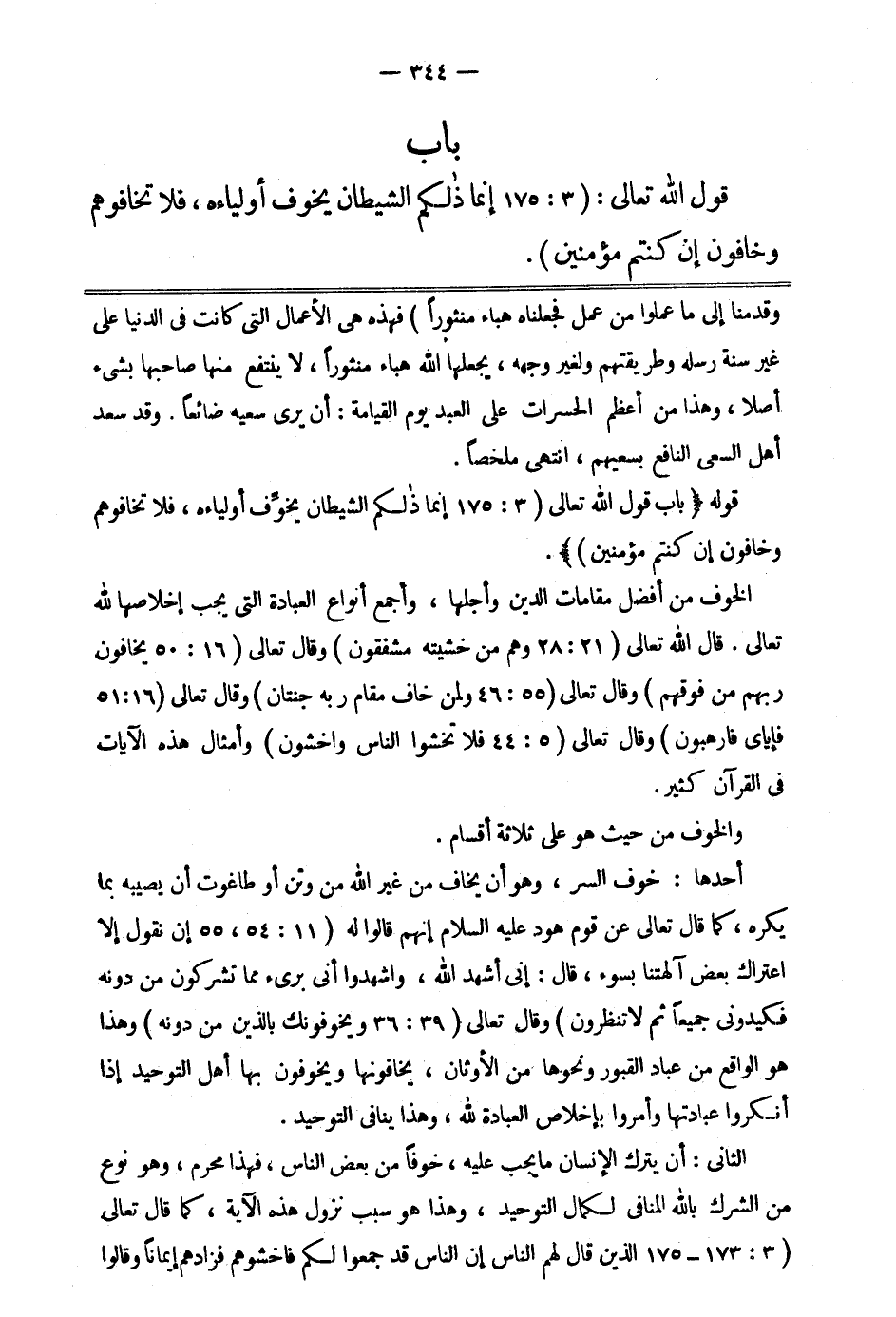باب: قول الله تعالى: {إِنَّمَا ذَلِكُمُ الشَّيْطَانُ يُخَوِّفُ أَوْلِيَاءَهُ فَلا تَخَافُوهُمْ وَخَافُونِ إِنْ كُنْتُمْ مُؤْمِنِينَ} 1.