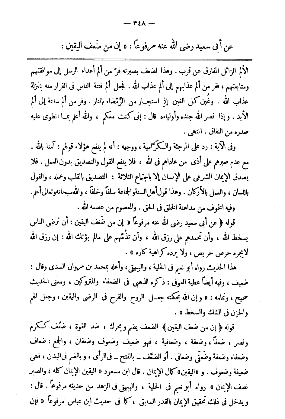 قوله: " عن أبي سعيد مرفوعا. " إن من ضعف اليقين أن ترضي الناس بسخط الله، وأن تحمدهم على رزق الله، وأن تذمهم على ما لم يؤتك الله; إن رزق الله لا يجره حرص حريص، ولا يرده كراهية كاره " 1".