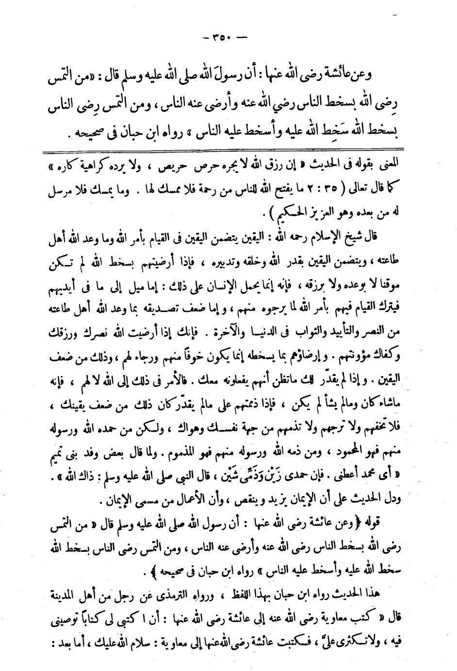 قوله: "وعن عائشة -رضي الله عنها- أن رسول الله صلى الله عليه وسلم قال: " من التمس رضا الله بسخط الناس، رضي الله عنه وأرضى عنه الناس، ومن التمس رضا الناس بسخط الله، سخط الله عليه وأسخط عليه الناس ". رواه ابن حبان في صحيحه".