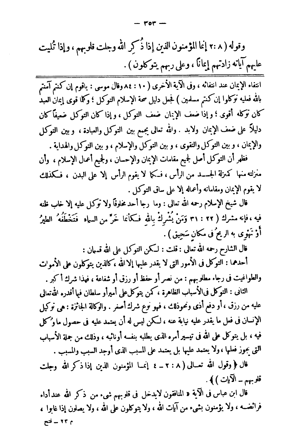 انتفاء الإيمان عند انتفائه; وفي الآية الأخرى: {وَقَالَ مُوسَى يَا قَوْمِ إِنْ كُنْتُمْ آمَنْتُمْ بِاللَّهِ فَعَلَيْهِ تَوَكَّلُوا إِنْ كُنْتُمْ مُسْلِمِينَ} 1. فجعل دليل صحة الإسلام التوكل، وكلما قوي إيمان العبد كان توكله أقوى، وإذا ضعف الإيمان ضعف التوكل، وإذا كان التوكل ضعيفا كان دليلا على ضعف الإيمان ولا بد. والله تعالى يجمع بين التوكل والعبادة، وبين التوكل والإيمان وبين التوكل والتقوى، وبين التوكل والإسلام، وبين التوكل والهداية.