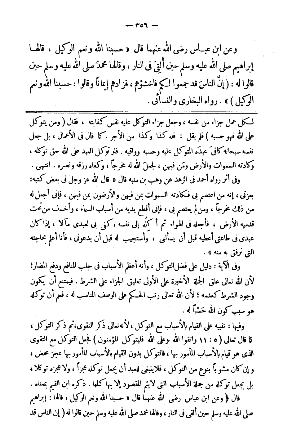 وعن ابن عباس قال: " حسبنا الله ونعم الوكيل، قالها إبراهيم صلى الله عليه وسلم حين ألقي في النار، وقالها محمد صلى الله عليه وسلم حين قالوا له: {إِنَّ النَّاسَ قَدْ جَمَعُوا لَكُمْ فَاخْشَوْهُمْ فَزَادَهُمْ إِيمَاناً وَقَالُوا حَسْبُنَا اللَّهُ وَنِعْمَ الْوَكِيلُ} 1 " رواه البخاري والنسائي2.