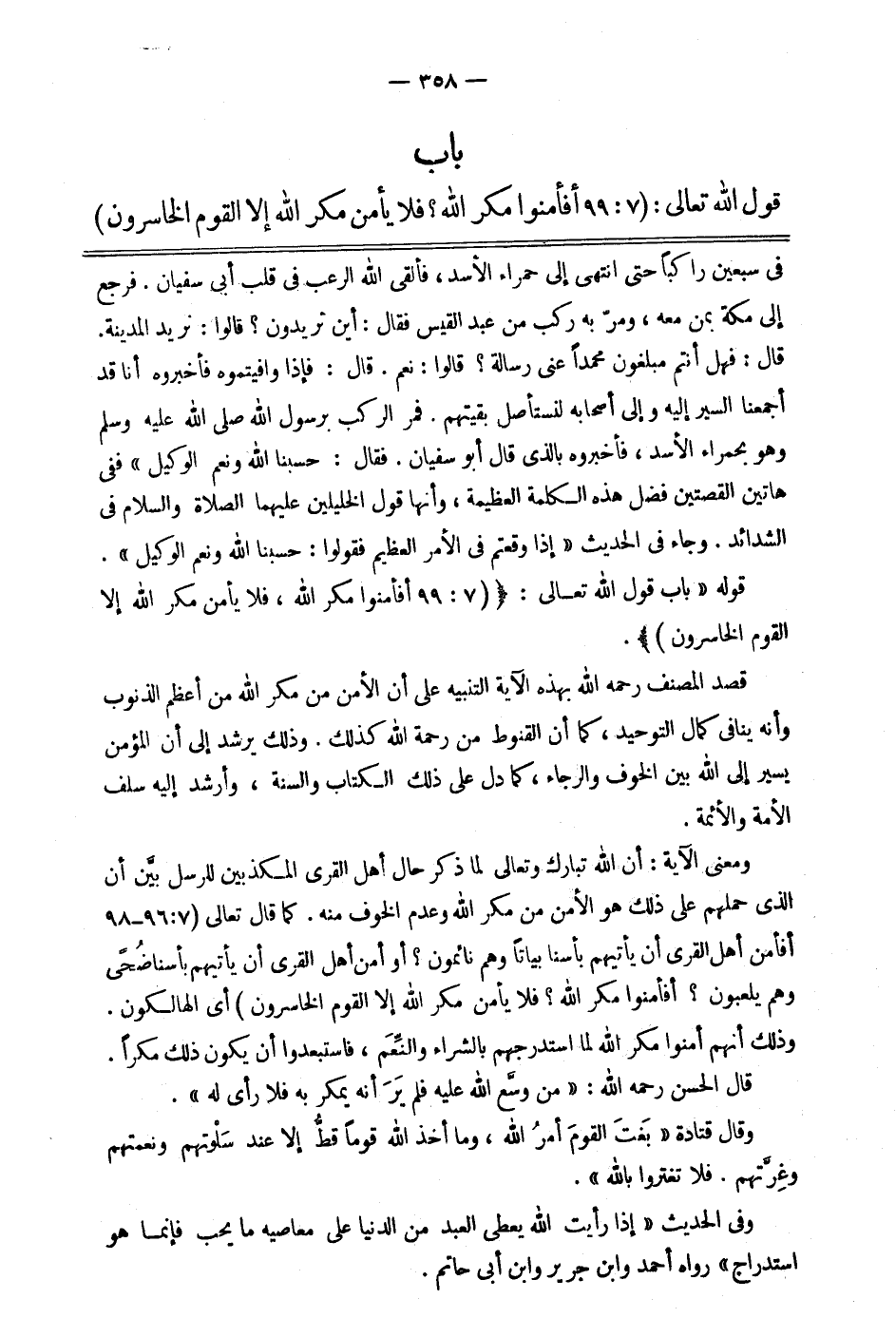 باب: قول الله تعالى: {أَفَأَمِنُوا مَكْرَ اللَّهِ فَلا يَأْمَنُ مَكْرَ اللَّهِ إِلَّا الْقَوْمُ الْخَاسِرُونَ} 1.