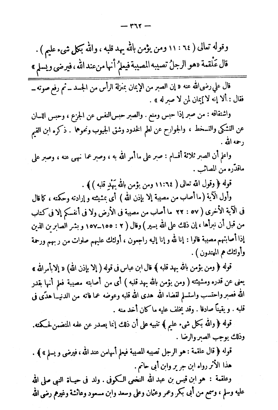 وقوله تعالى: {وَمَنْ يُؤْمِنْ بِاللَّهِ يَهْدِ قَلْبَهُ وَاللَّهُ بِكُلِّ شَيْءٍ عَلِيمٌ} 1. قال علقمة: " هو الرجل تصيبه المصيبة فيعلم أنها من عند الله، فيرضى ويسلم".