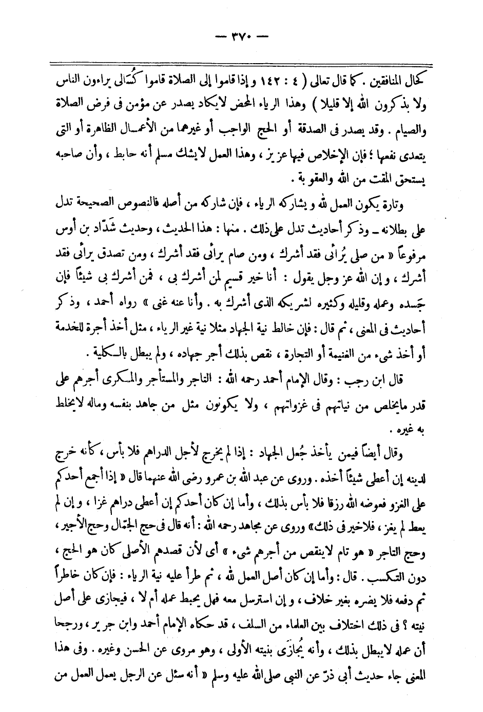وتارة يكون العمل لله ويشاركه الرياء، فإن شاركه من أصله فالنصوص الصحيحة تدل على بطلانه. وذكر أحاديث تدل على ذلك منها: هذا الحديث وحديث شداد بن أوس مرفوعا: " من صلى يرائي فقد أشرك، ومن صام يرائي فقد أشرك، ومن تصدق يرائي فقد أشرك، وإن الله عز وجل يقول: أنا خير قسيم لمن أشرك بي، فمن أشرك بي شيئا فإن جِدّة عمله وقليله وكثيره لشريكه الذي أشرك به. أنا عنه غني " 2. رواه أحمد. وذكر أحاديث في المعنى ثم قال: فإن خالط نية الجهاد مثلا نية غير الرياء، مثل أخذ أجرة الخدمة، أو أخذ شيء من الغنيمة أو التجارة نقص بذلك أجر جهاده ولم يبطل بالكلية.