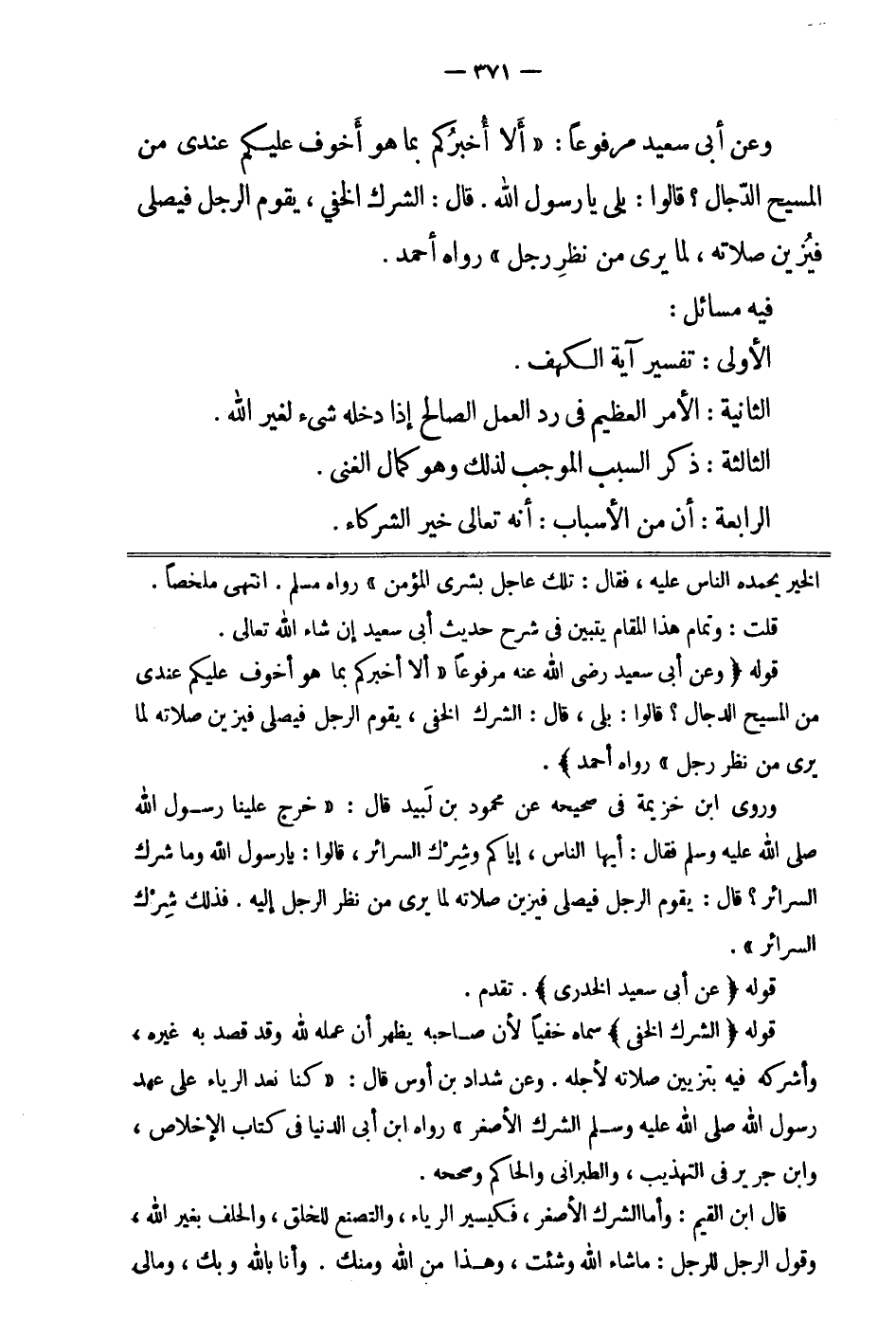 قوله: "وعن أبي سعيد رضي الله عنه مرفوعا: " ألا أخبركم بما هو أخوف عليكم عندي من المسيح الدجال؟ قالوا: بلى يا رسول الله. قال: الشرك الخفي، يقوم الرجل فيصلي فيزين صلاته لما يرى من نظر رجل " 2. رواه أحمد".