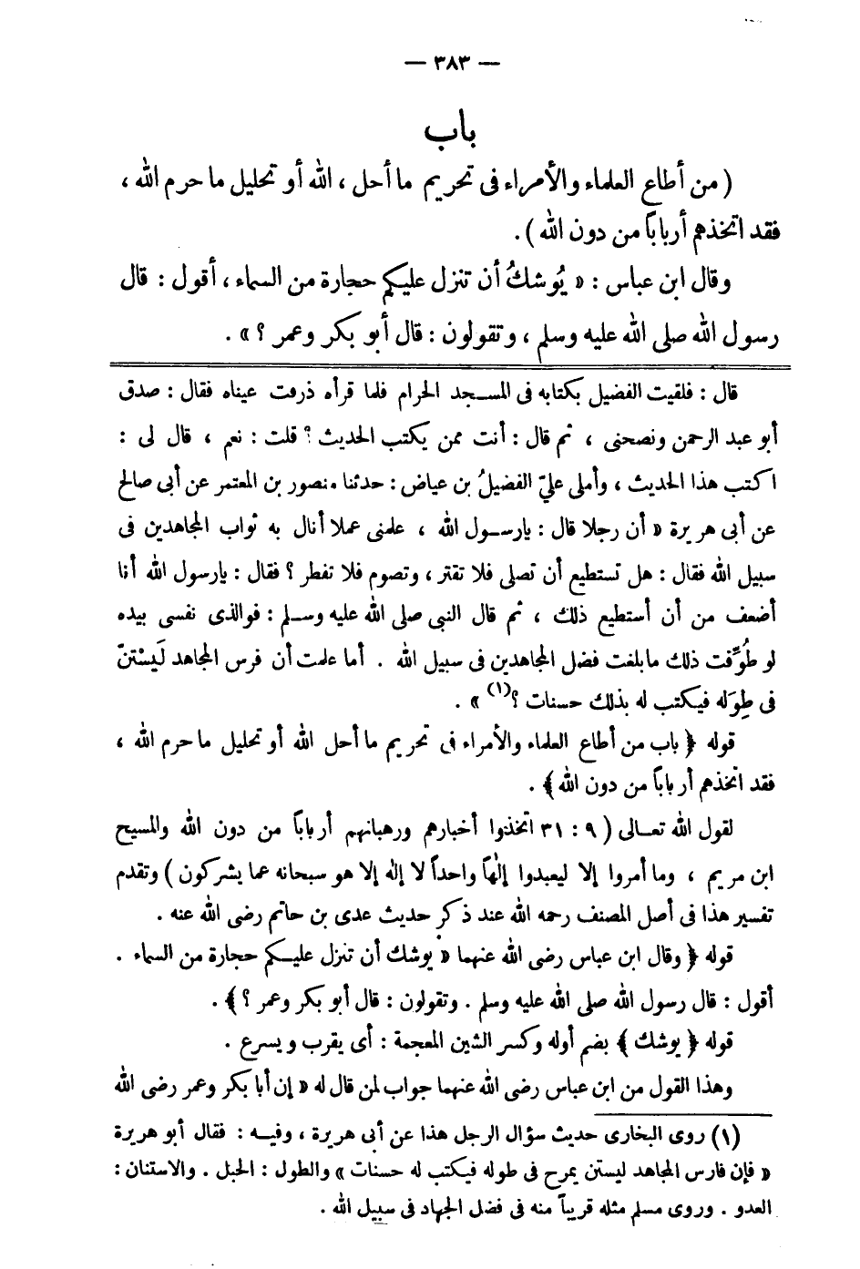 باب: " من أطاع العلماء والأمراء في تحريم ما أحل الله أو تحليل ما حرم الله، فقد اتخذهم أربابا من دون الله"