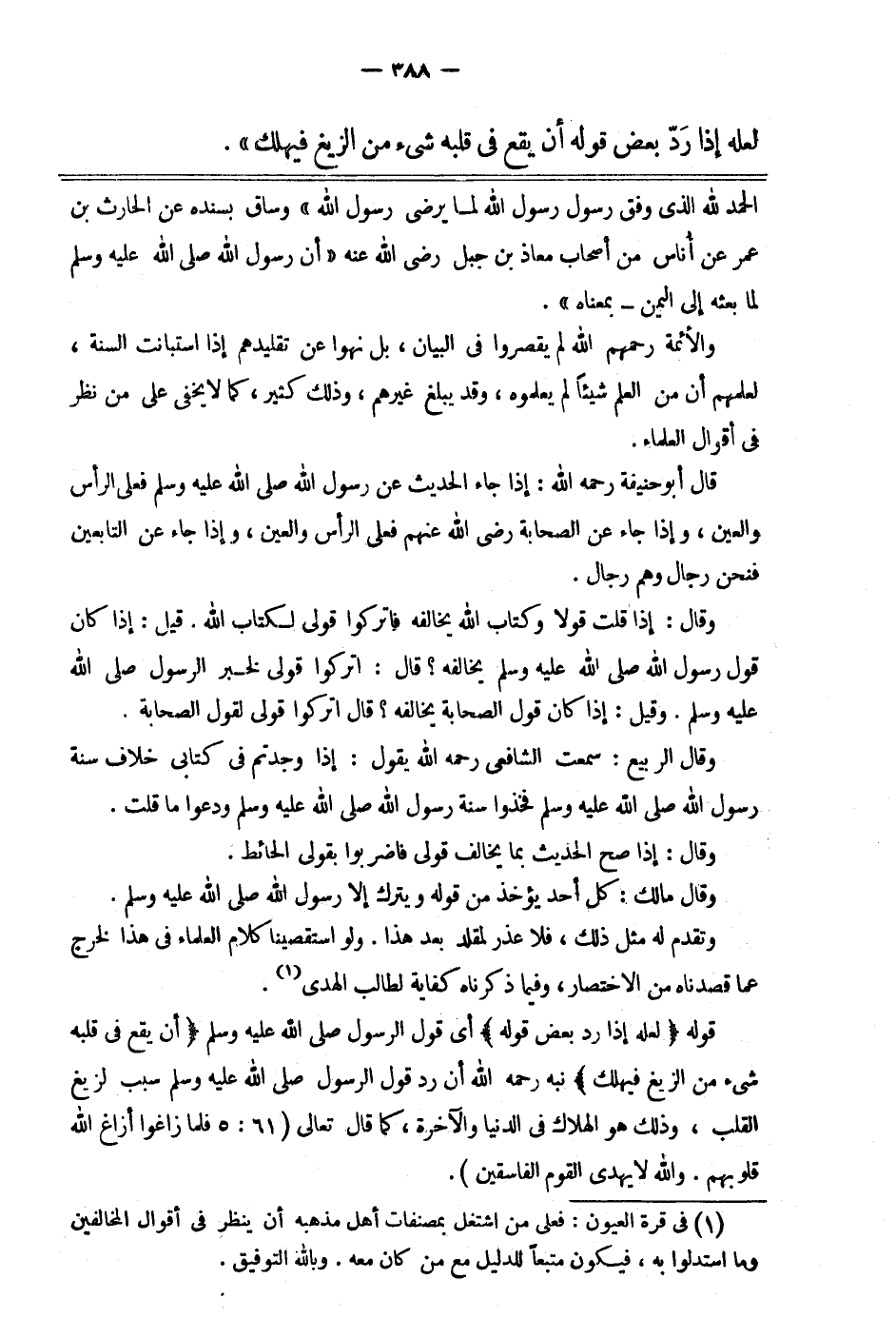 قوله: "لعله إذا رد بعض قوله" أي قول الرسول صلى الله عليه وسلم "أن يقع في قلبه شيء من الزيغ فيهلك" نبه -رحمه الله- أن رد قول الرسول صلى الله عليه وسلم سبب لزيغ القلب، وذلك هو الهلاك في الدنيا والآخرة كما قال تعالى: {فَلَمَّا زَاغُوا أَزَاغَ اللَّهُ قُلُوبَهُمْ وَاللَّهُ لا يَهْدِي الْقَوْمَ الْفَاسِقِينَ} 3.