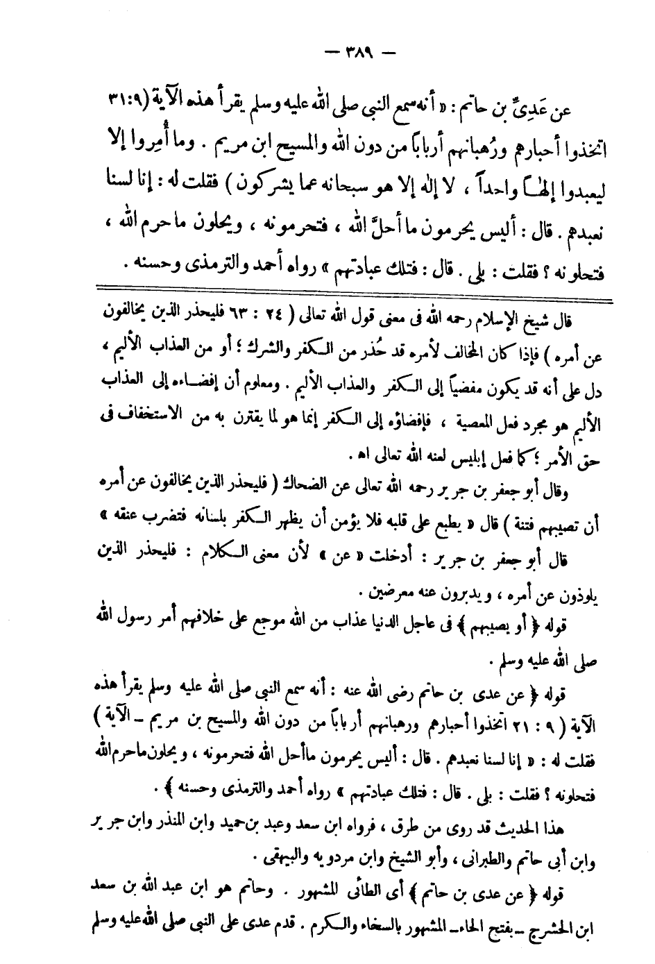 (وَرُهْبَانَهُمْ أَرْبَاباً مِنْ دُونِ اللَّهِ وَالْمَسِيحَ ابْنَ مَرْيَمَ وَمَا أُمِرُوا إِلا لِيَعْبُدُوا إِلَهاً وَاحِداً لا إِلَهَ إِلا هُوَ سُبْحَانَهُ عَمَّا يُشْرِكُونَ} 3. فقلت له: " إنا لسنا نعبدهم. قال: أليس يحرمون ما أحل الله فتحرمونه، ويحلون ما حرم الله فتحلونه؟ فقلت: بلى. قال: فتلك عبادتهم ". رواه أحمد والترمذي وحسنه4.