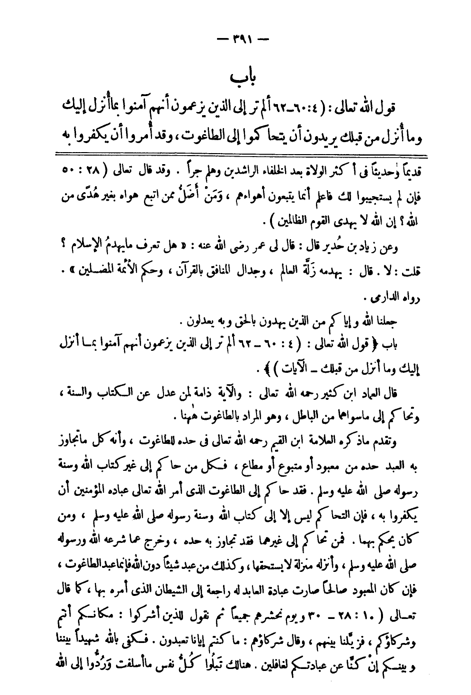 باب "قول الله تعالى: {أَلَمْ تَرَ إِلَى الَّذِينَ يَزْعُمُونَ أَنَّهُمْ آمَنُوا بِمَا أُنْزِلَ إِلَيْكَ وَمَا أُنْزِلَ مِنْ قَبْلِكَ} 1 الآيات.