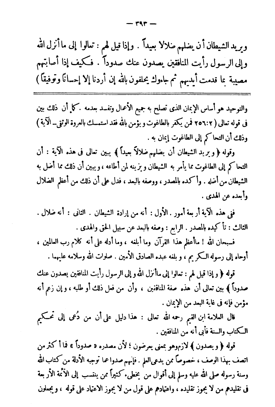 والتوحيد هو أساس الإيمان الذي تصلح به جميع الأعمال وتفسد بعدمه؛ كما أن ذلك بين في قوله تعالى: {فَمَنْ يَكْفُرْ بِالطَّاغُوتِ وَيُؤْمِنْ بِاللَّهِ فَقَدِ اسْتَمْسَكَ بِالْعُرْوَةِ الْوُثْقَى} 1 الآية. وذلك أن التحاكم إلى الطاغوت إيمان به. وقوله: {وَيُرِيدُ الشَّيْطَانُ أَنْ يُضِلَّهُمْ ضَلالاً بَعِيداً} 2 يبين تعالى في هذه الآية