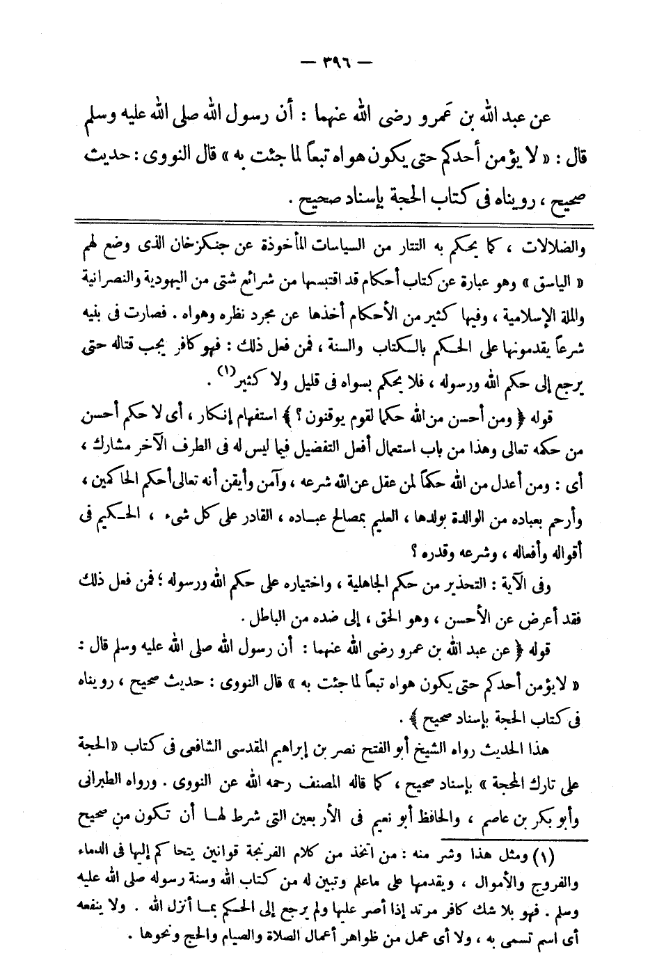 قوله: "عن عبد الله بن عمرو -رضي الله عنهما-: أن رسول الله صلى الله عليه وسلم قال: " لا يؤمن أحدكم حتى يكون هواه تبعا لما جئت به " 3. قال النووي: " حديث صحيح رويناه في كتاب الحجة بإسناد صحيح".