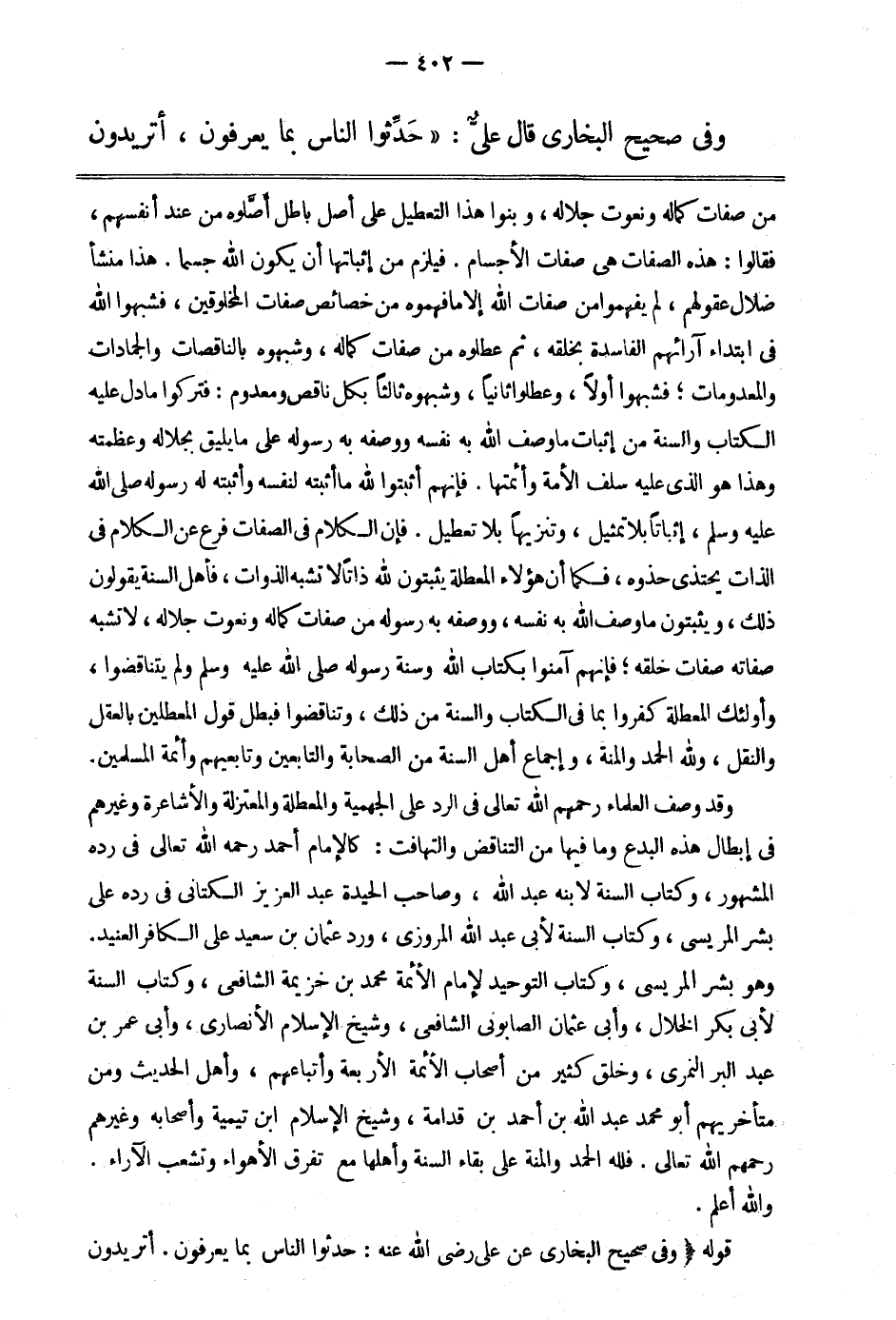 وقد صنف العلماء -رحمهم الله تعالى- في الرد على الجهمية والمعطلة والمعتزلة والأشاعرة وغيرهم في إبطال هذه البدع، وما فيها من التناقض والتهافت: كالإمام أحمد -رحمه الله تعالى- في رده المشهور، وكتاب السنة لابنه عبد الله، وصاحب الحيدة عبد العزيز الكتاني في رده على بشر المريسي، وكتاب السنة لأبي عبد الله المروزي، ورد عثمان بن سعيد على الكافر العنيد. وهو بشر المريسي، وكتاب التوحيد لإمام الأئمة محمد بن خزيمة الشافعي، وكتاب السنة لأبي بكر الخلال، وأبي عثمان الصابوني الشافعي، وشيخ الإسلام الأنصاري، وأبي عمر بن عبد البر النمري، وخلق كثير من أصحاب الأئمة الأربعة وأتباعهم، وأهل الحديث. ومن متأخريهم: أبو محمد عبد الله بن أحمد بن قدامة، وشيخ الإسلام ابن تيمية وأصحابه وغيرهم -رحمهم الله تعالى-. فلله الحمد والمنة على بقاء السنة وأهلها مع تفرق الأهواء وتشعب الآراء. والله أعلم.