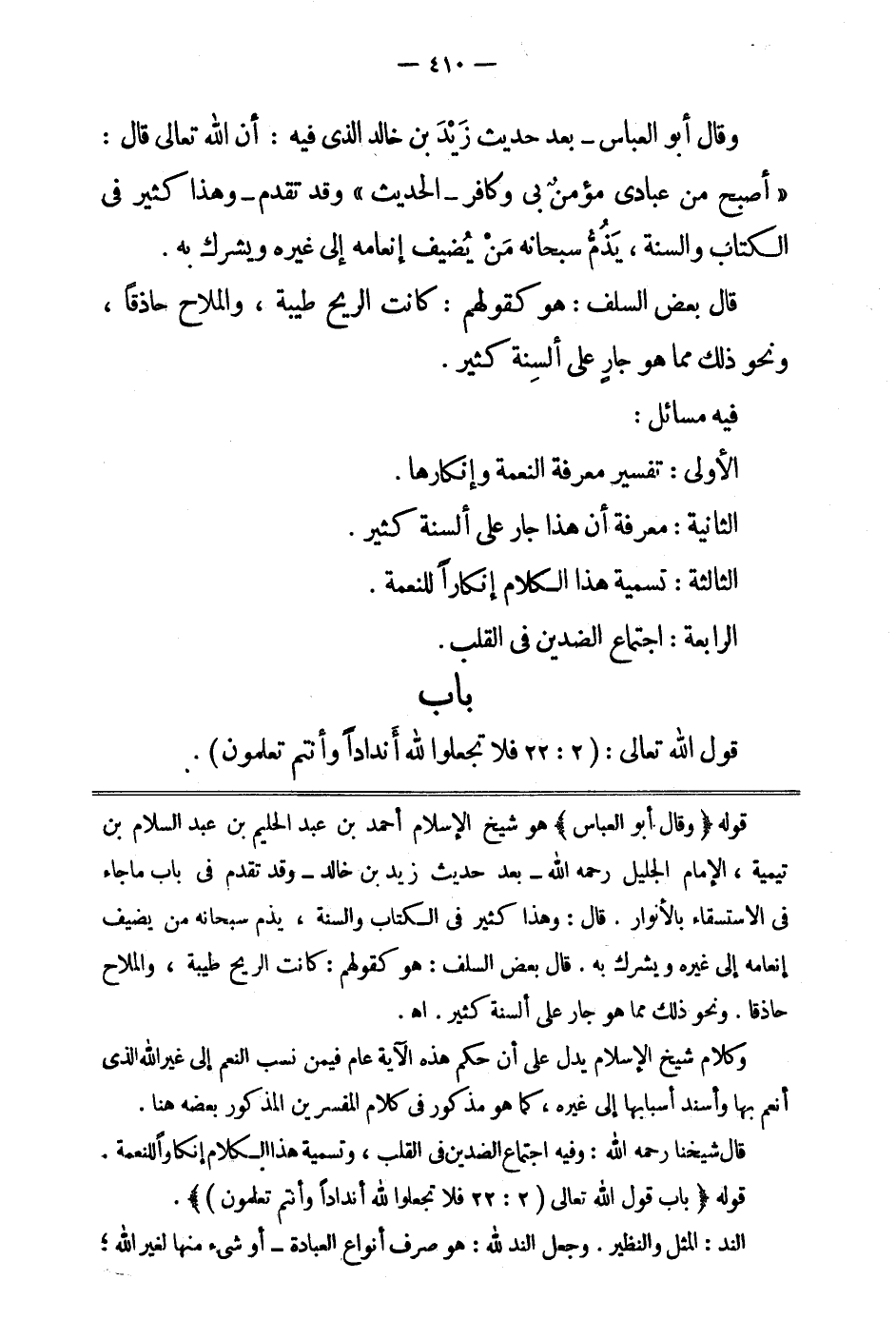 قوله: "باب قول الله تعالى: {فَلا تَجْعَلُوا لِلَّهِ أَنْدَاداً وَأَنْتُمْ تَعْلَمُونَ} ". الند: المثل والنظير. وجعل الند لله: هو صرف أنواع العباده أو شيء منها لغير الله،