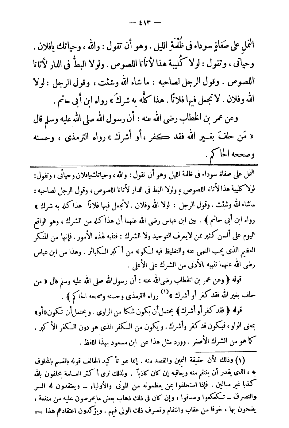 "وعن عمر بن الخطاب رضي الله عنه أن رسول الله صلى الله عليه وسلم قال: " من حلف بغير الله فقد كفر أو أشرك " 3. رواه الترمذي وحسنه وصححه الحاكم". قوله: "فقد كفر أو أشرك" يحتمل لي أن يكون شكا من الراوي، ويحتمل أن تكون أو بمعنى الواو، فيكون قد كفر وأشرك. ويكون من الكفر الذي هو دون الكفر الأكبر، كما هو من الشرك الأصغر. وورد مثل هذا عن ابن مسعود بهذا اللفظ.
