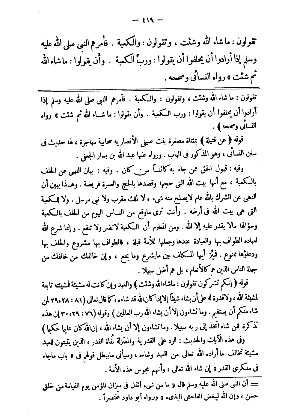 قوله: "إنكم تشركون. تقولون: ما شاء الله وشئت". والعبد وإن كانت له مشيئة فمشيئته تابعة لمشيئة الله، ولا قدرة له على أن يشاء شيئا إلا إذا كان الله قد شاءه، كما قال تعالى: {لِمَنْ شَاءَ مِنْكُمْ أَنْ يَسْتَقِيمَ وَمَا تَشَاءُونَ إِلَّا أَنْ يَشَاءَ اللَّهُ رَبُّ الْعَالَمِينَ} 2. وقوله: {إِنَّ هَذِهِ تَذْكِرَةٌ فَمَنْ شَاءَ اتَّخَذَ إِلَى رَبِّهِ سَبِيلاً وَمَا تَشَاءُونَ إِلَّا أَنْ يَشَاءَ اللَّهُ إِنَّ اللَّهَ كَانَ عَلِيماً حَكِيماً} 3.
