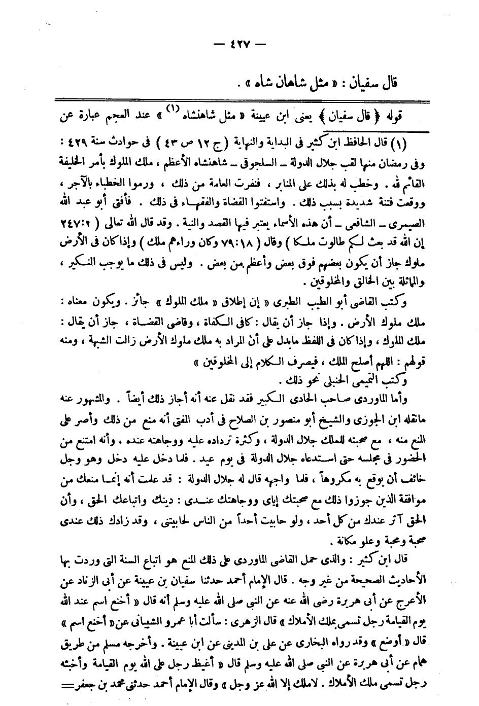 1 قال الحافظ ابن كثير في البداية والنهاية (ج 12 ص 43) في حوادث سنة 429: وفي رمضان منها لقب جلال الدولة - السلجوقي - شاهنشاه الأعظم، ملك الملوك بأمر الخليفة القائم لله، وخطب له بذلك على المنابر, فنفرت العامة من ذلك, ورموا الخطباء بالآجر, ووقعت فتنة شديدة بسبب ذلك. واستفتوا القضاة والفقهاء في ذلك، فأفتى أبو عبد الله الصيمري -الشافعي- أن هذه الأسماء يعتبر فيها القصد والنية. وقد قال تعالى: (إن الله قد بعث لكم طالوت ملكا) . وقال: (وكان وراءهم ملك) . وإذا كان في الأرض ملوك جاز أن يكون بعضهم فوق بعض وأعظم من بعض، وليس في ذلك ما يوجب النكير. والمماثلة بين الخالق والمخلوقين. وكتب القاضي أبو الطيب الطبري: "أن إطلاق (ملك الملوك) جائز، ويكون معناه: ملك ملوك الأرض. وإذا جاز أن يقال: كافي الكفاة وقاضي القضاة; جاز أن يقال: ملك الملوك, وإذا كان في اللفظ ما يدل على أن المراد به ملك ملوك الأرض زالت الشبهة. ومنه قولهم: اللهم أصلح الملك, فيصرف الكلام إلى المخلوقين". وكتب التميمي الحنبلي نحو ذلك. =