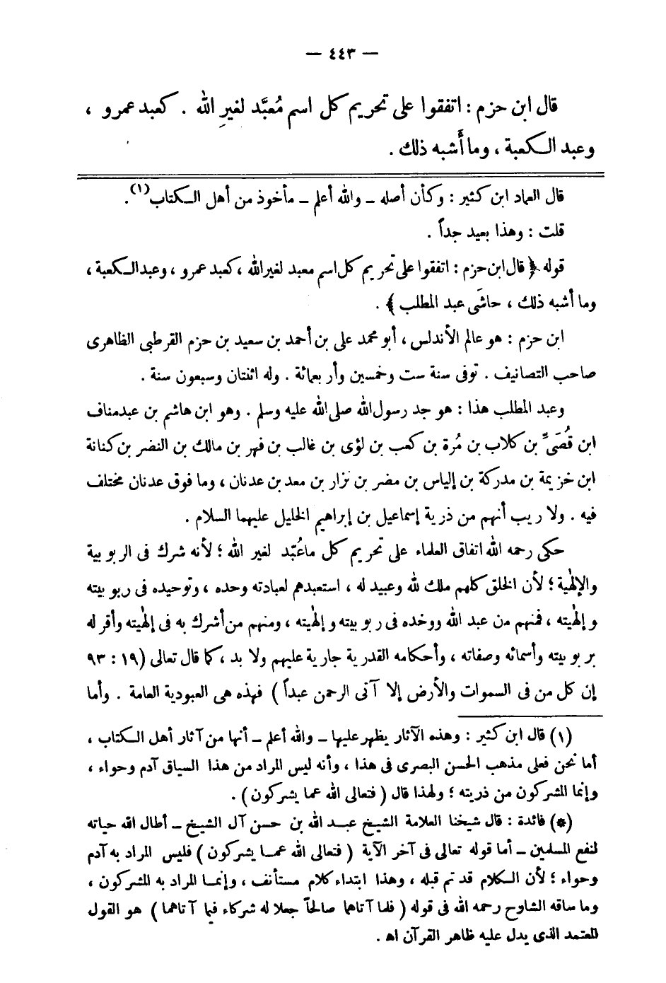 قوله: "قال ابن حزم: اتفقوا على تحريم كل اسم معبد لغير الله كعبد عمرو وعبد الكعبة، وما أشبه ذلك، حاشا عبد المطلب".
