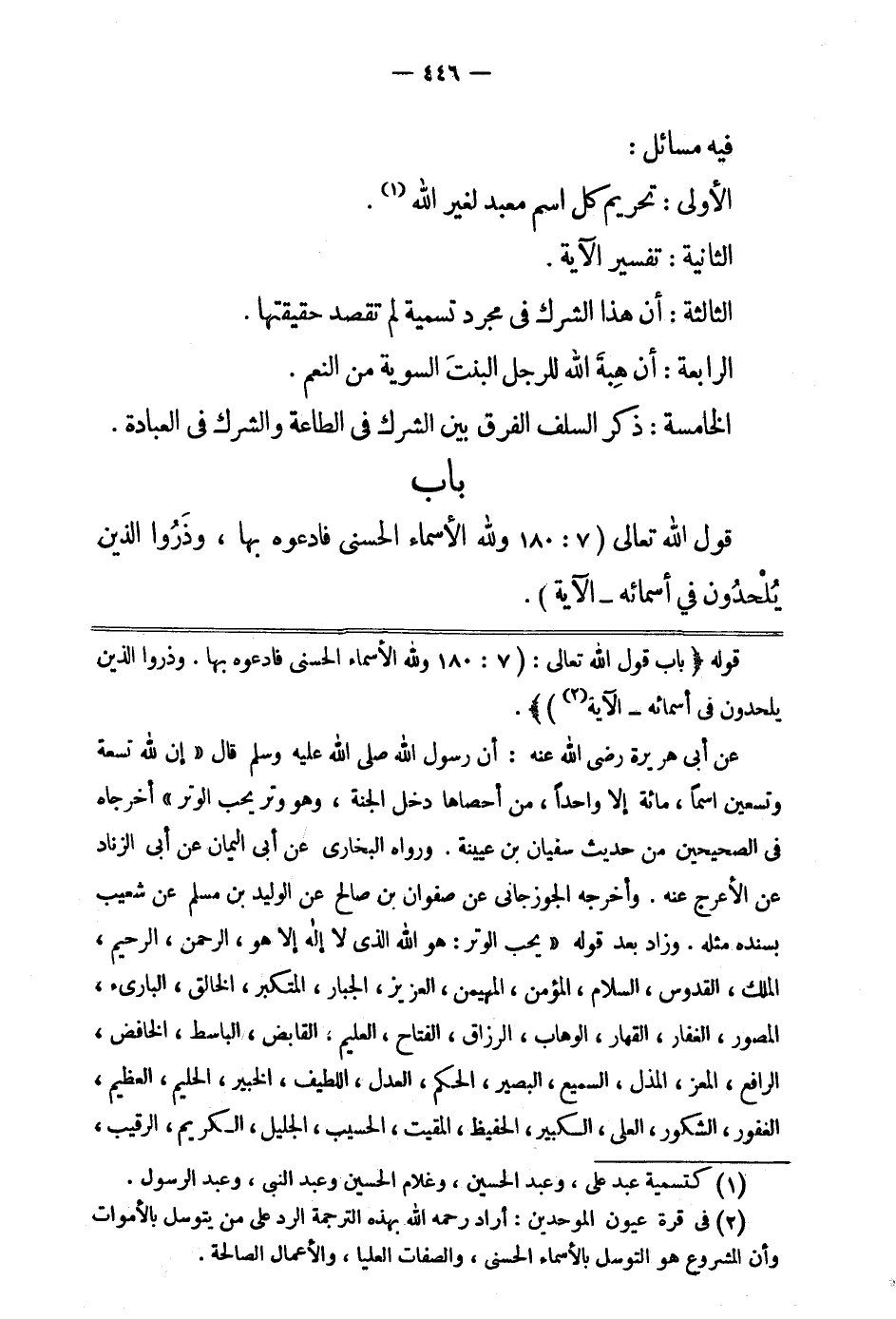 2 في قرة عيون الموحدين: أراد -رحمه الله- بهذه الترجمة الرد على من يتوسل بالأموات، وأن المشروع هو التوسل بالأسماء الحسنى والصفات العليا, والأعمال الصالحة.