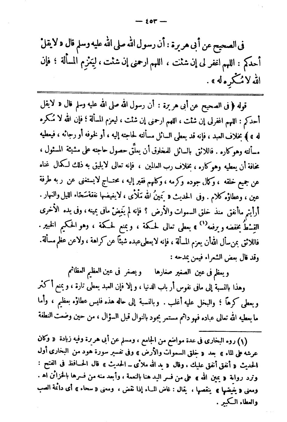 قوله: "في الصحيح عن أبي هريرة أن رسول الله صلى الله عليه وسلم قال: " لا يقل أحدكم اللهم اغفر لي إن شئت، اللهم ارحمني إن شئت. ليعزم المسألة فإن الله لا مكره له ". بخلاف العبد؛ فإنه قد يعطي السائل مسألته لحاجته إليه، أو لخوفه أو رجائه، فيعطيه مسألته وهو كاره. فاللائق بالسائل للمخلوق أن يعلق حصول حاجته على مشيئة المسئول; مخافة أن يعطيه وهو كاره، بخلاف رب العالمين؛ فإنه –تعالى- لا يليق به ذلك لكمال غناه عن جميع خلقه، وكمال جوده وكرمه، وكلهم فقير إليه، محتاج لا يستغني عن ربه طرفة عين، وعطاؤه كلام.