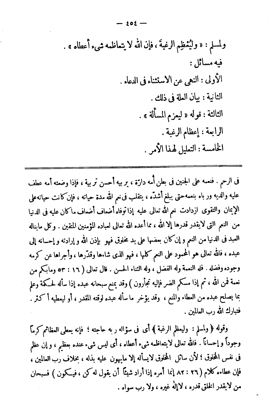 وقوله: "ولمسلم: "وليعظم الرغبة" أي في سؤاله ربه حاجته; فإنه يعطي العظائم كرما وجودا وإحسانا. فالله تعالى لا يتعاظمه شيء أعطاه، أي ليس شيء عنده بعظيم، وإن عظم في نفس المخلوق؛ لأن سائل المخلوق لا يسأله إلا ما يهون عليه بذله بخلاف رب العالمين، فإن عطاءه كلام {إِنَّمَا أَمْرُهُ إِذَا أَرَادَ شَيْئاً أَنْ يَقُولَ لَهُ كُنْ فَيَكُونُ} 3. فسبحان من لا يقدر الخلق قدره، لا إله غيره ولا رب سواه.