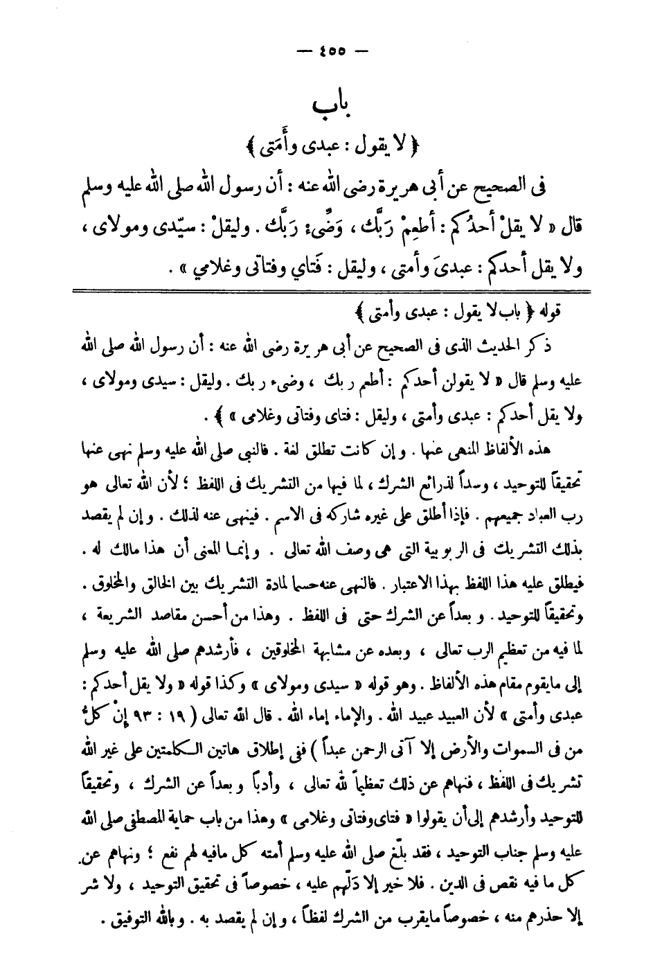 هذه الألفاظ المنهي عنها وإن كانت تطلق لغة، فالنبي صلى الله عليه وسلم نهى عنها تحقيقا للتوحيد، وسدا لذرائع الشرك؛ لما فيها من التشريك في اللفظ؛ لأن الله تعالى هو رب العباد جميعهم. فإذا أطلق على غيره شاركه في الاسم، فينهى عنه لذلك. وإن لم يقصد بذلك التشريك في الربوبية التي هي وصف الله تعالى. وإنما المعنى أن هذا مالك له. فيطلق عليه هذا اللفظ بهذا الاعتبار. فالنهي عنه حسما لمادة التشريك بين الخالق والمخلوق، وتحقيقا للتوحيد، وبعدا عن الشرك حتى في اللفظ. وهذا من أحسن مقاصد الشريعة؛ لما فيه من تعظيم الرب تعالى، وبعده عن مشابهة المخلوقين، فأرشدهم صلى الله عليه وسلم إلى ما يقوم مقام هذه الألفاظ. وهو قوله: "سيدي ومولاي" وكذا قوله: " ولا يقل أحدكم عبدي وأمتي "؛ لأن العبيد عبيد الله، والإماء إماء الله. قال الله تعالى: {إِنْ كُلُّ مَنْ فِي السَّمَاوَاتِ وَالأَرْضِ إِلَّا آتِي الرَّحْمَنِ عَبْداً} 2. ففي إطلاق هاتين الكلمتين على غير الله تشريك في اللفظ، فنهاهم عن ذلك تعظيما لله تعالى وأدبا وبعدا عن الشرك وتحقيقا للتوحيد. وأرشدهم إلى أن يقولوا: "فتاي وفتاتي وغلامي". وهذا من باب حماية المصطفى صلى الله عليه وسلم جناب التوحيد، فقد بلّغ صلى الله عليه وسلم أمته كل ما فيه لهم نفع، ونهاهم عن كل ما فيه نقص في الدين. فلا خير إلا دلهم عليه، خصوصا في تحقيق التوحيد، ولا شر إلا حذرهم منه، خصوصا ما يقرب من الشرك لفظا وإن لم يقصد به. وبالله التوفيق.