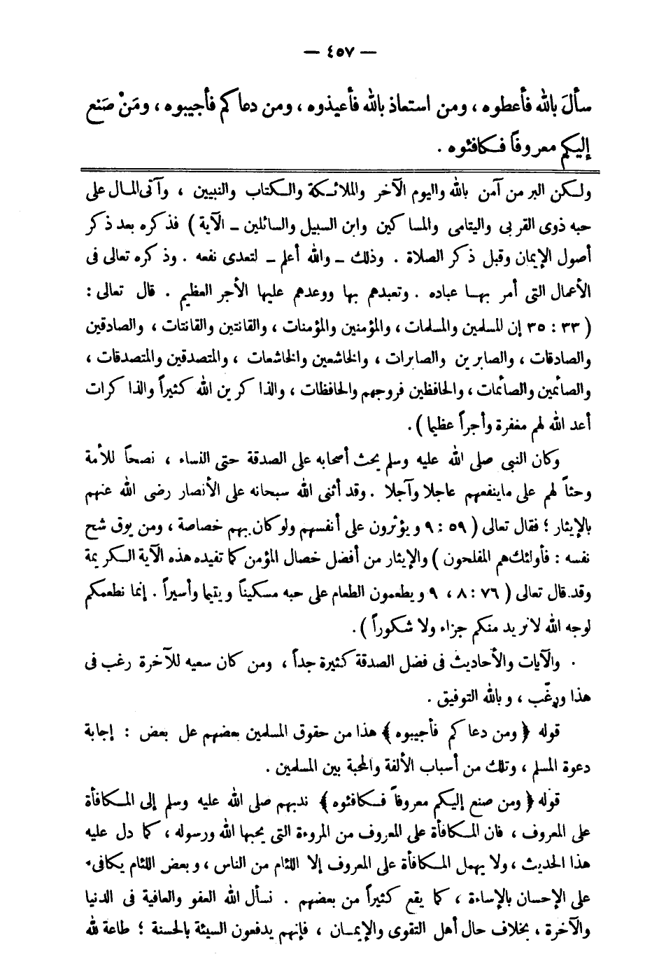 وَلَكِنَّ الْبِرَّ مَنْ آمَنَ بِاللَّهِ وَالْيَوْمِ الْآخِرِ وَالْمَلائِكَةِ وَالْكِتَابِ وَالنَّبِيِّينَ وَآتَى الْمَالَ عَلَى حُبِّهِ ذَوِي الْقُرْبَى وَالْيَتَامَى وَالْمَسَاكِينَ وَابْنَ السَّبِيلِ وَالسَّائِلِينَ} 1 الآية. فذكره بعد ذكر أصول الإيمان وقبل ذكر الصلاة. ذلك- والله أعلم- لتعدي نفعه. وذكره –تعالى- في الأعمال التي أمر بها عباده، وتعبدهم بها ووعدهم عليها الأجر العظيم. قال تعالى: {إِنَّ الْمُسْلِمِينَ وَالْمُسْلِمَاتِ وَالْمُؤْمِنِينَ وَالْمُؤْمِنَاتِ وَالْقَانِتِينَ وَالْقَانِتَاتِ وَالصَّادِقِينَ وَالصَّادِقَاتِ وَالصَّابِرِينَ وَالصَّابِرَاتِ وَالْخَاشِعِينَ وَالْخَاشِعَاتِ وَالْمُتَصَدِّقِينَ وَالْمُتَصَدِّقَاتِ وَالصَّائِمِينَ وَالصَّائِمَاتِ وَالْحَافِظِينَ فُرُوجَهُمْ وَالْحَافِظَاتِ وَالذَّاكِرِينَ اللَّهَ كَثِيراً وَالذَّاكِرَاتِ أَعَدَّ اللَّهُ لَهُمْ مَغْفِرَةً وَأَجْراً عَظِيماً} 2.