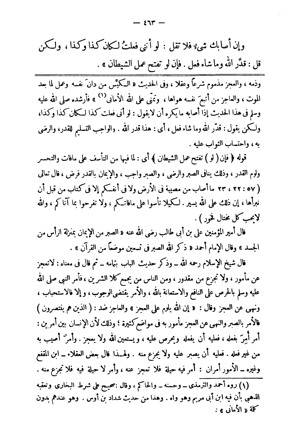 قوله: "فإن "لو" تفتح عمل الشيطان" أي لما فيها من التأسف على ما فات والتحسر ولوم القدر، وذلك ينافي الصبر والرضى، والصبر واجب، والإيمان بالقدر