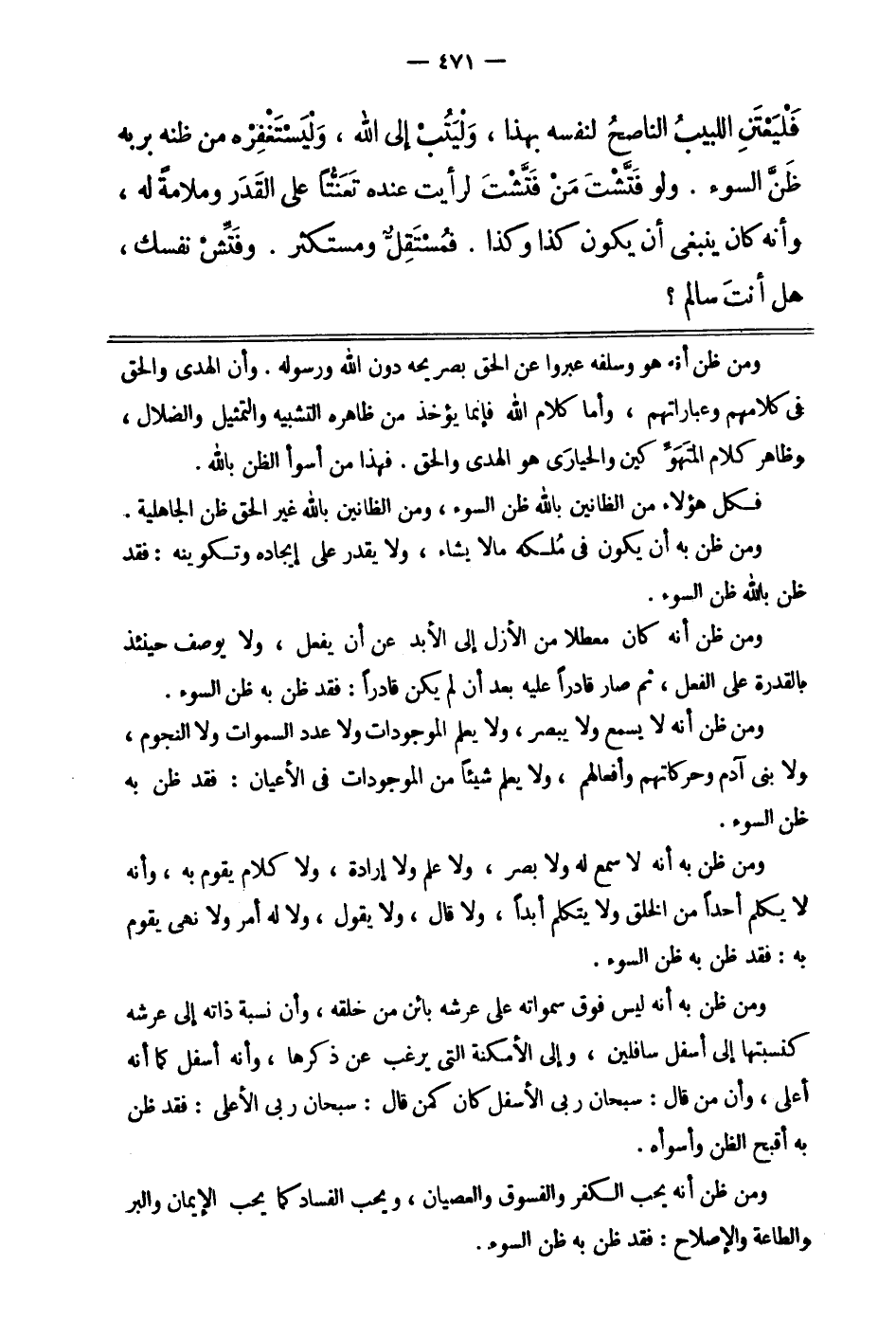 ومن ظن به أن يكون في مُلكه ما لا يشاء ولا يقدر على إيجاده وتكوينه، فقد ظن بالله ظن السوء. ومن ظن أنه كان معطلا من الأزل إلى الأبد عن أن يفعل، ولا يوصف حينئذ بالقدرة على الفعل، ثم صار قادرا عليه بعد أن لم يكن قادرا، فقد ظن به ظن السوء.