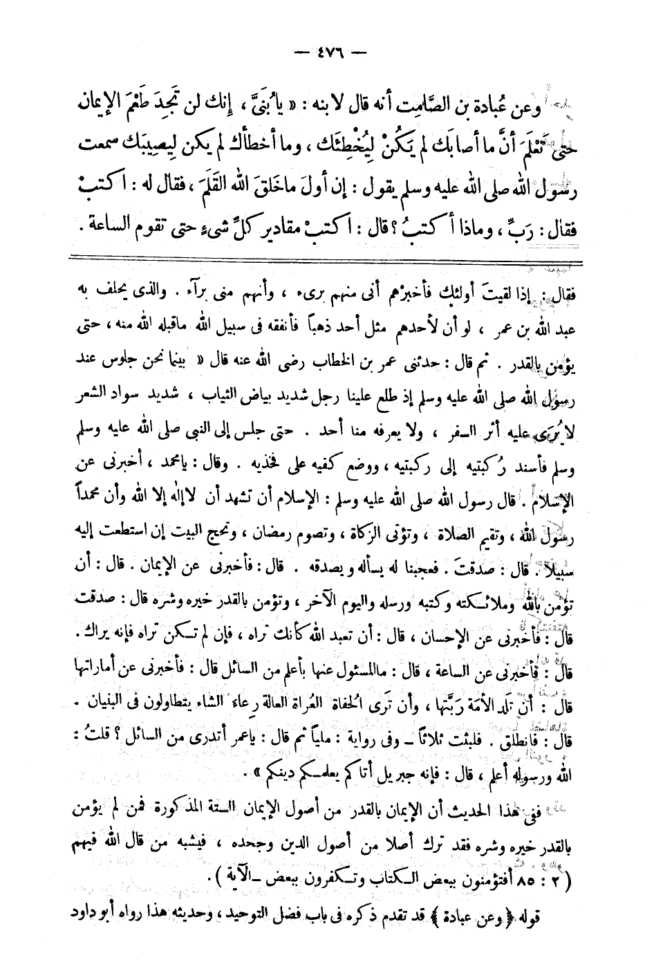 ثم قال: حدثني عمر بن الخطاب رضي الله عنه قال: " بينما نحن جلوس عند رسول الله صلى الله عليه وسلم إذ طلع علينا رجل شديد بياض الثياب، شديد سواد الشعر، لا يرى عليه أثر السفر، ولا يعرفه منا أحد، حتى جلس إلى النبي صلى الله عليه وسلم فأسند ركبتيه إلى ركبتيه، ووضع كفيه على فخذيه. وقال: يا محمد أخبرني عن الإسلام؟ قال رسول الله صلى الله عليه وسلم: الإسلام أن تشهد أن لا إله إلا الله وأن محمدا رسول الله، وتقيم الصلاة وتؤتي الزكاة، وتصوم رمضان، وتحج البيت إن استطعت إليه سبيلا. قال: صدقت. فعجبنا له يسأله ويصدقه. قال: فأخبرني عن الإيمان؟ قال: أن تؤمن بالله وملائكته وكتبه ورسله واليوم الآخر، وتؤمن بالقدر خيره وشره. قال: صدقت. قال: فأخبرني عن الإحسان؟ قال: أن تعبد الله كأنك تراه فإن لم تكن تراه فإنه يراك. قال: فأخبرني عن الساعة؟ قال: ما المسئول عنها بأعلم من السائل. قال فأخبرني عن أماراتها؟ قال: أن تلد الأمة ربتها، وأن ترى الحفاة العراة العالة رعاء الشاء يتطاولون في البنيان. قال: فانطلق. فلبثت ثلاثا. وفي رواية: مليا. ثم قال: يا عمر أتدري من السائل؟ قلت: الله ورسوله أعلم. قال: فإنه جبريل أتاكم يعلمكم دينكم " 1.