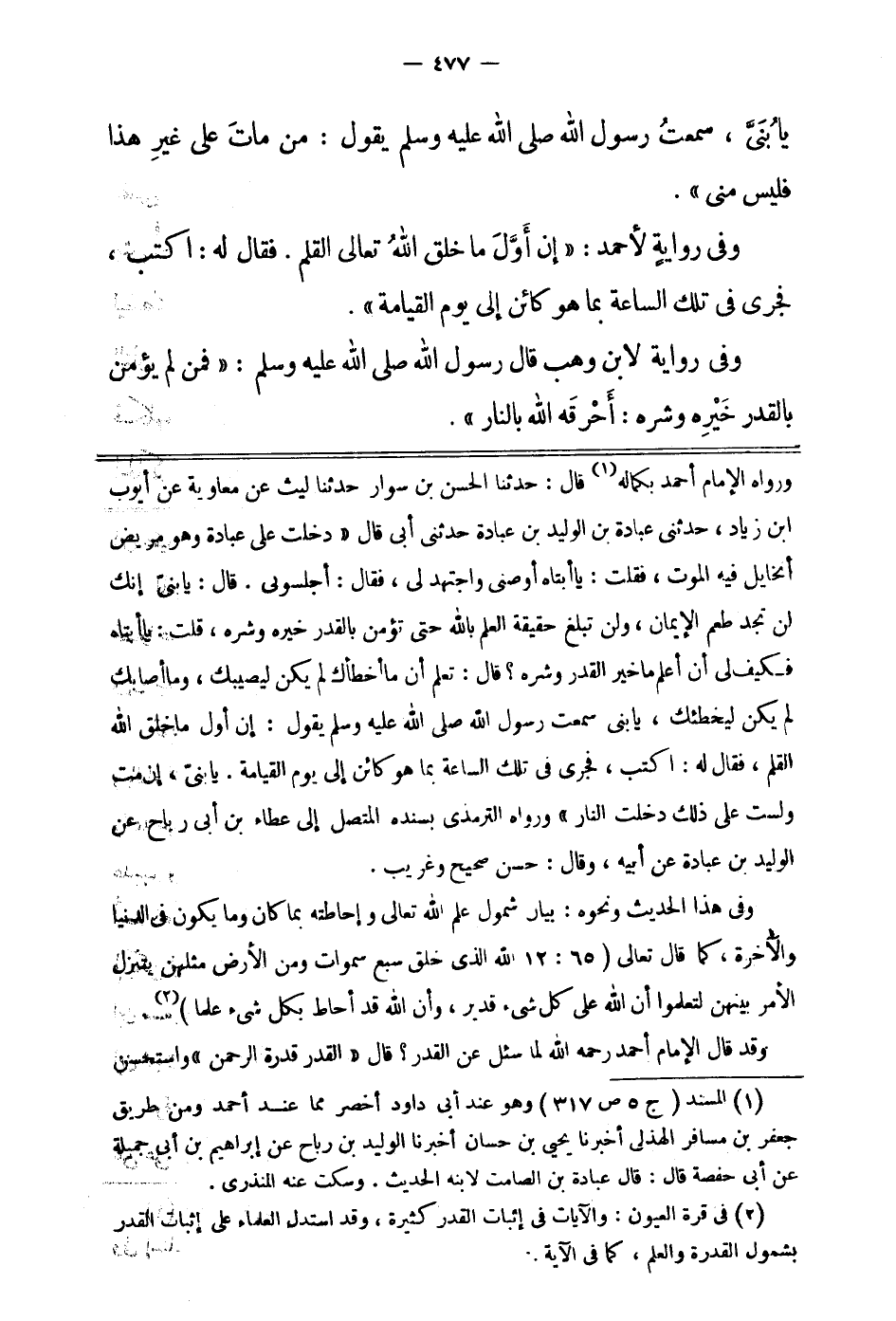 يا بني سمعت رسول الله صلى الله عليه وسلم يقول: " إن أول ما خلق الله القلم; فقال له: اكتب. فجرى في تلك الساعة بما هو كائن إلى يوم القيامة. يا بني، إن مت ولست على ذلك دخلت النار " ورواه الترمذي بسنده المتصل إلى عطاء ابن أبي رباح عن الوليد بن عبادة عن أبيه، وقال: حسن صحيح وغريب 2.