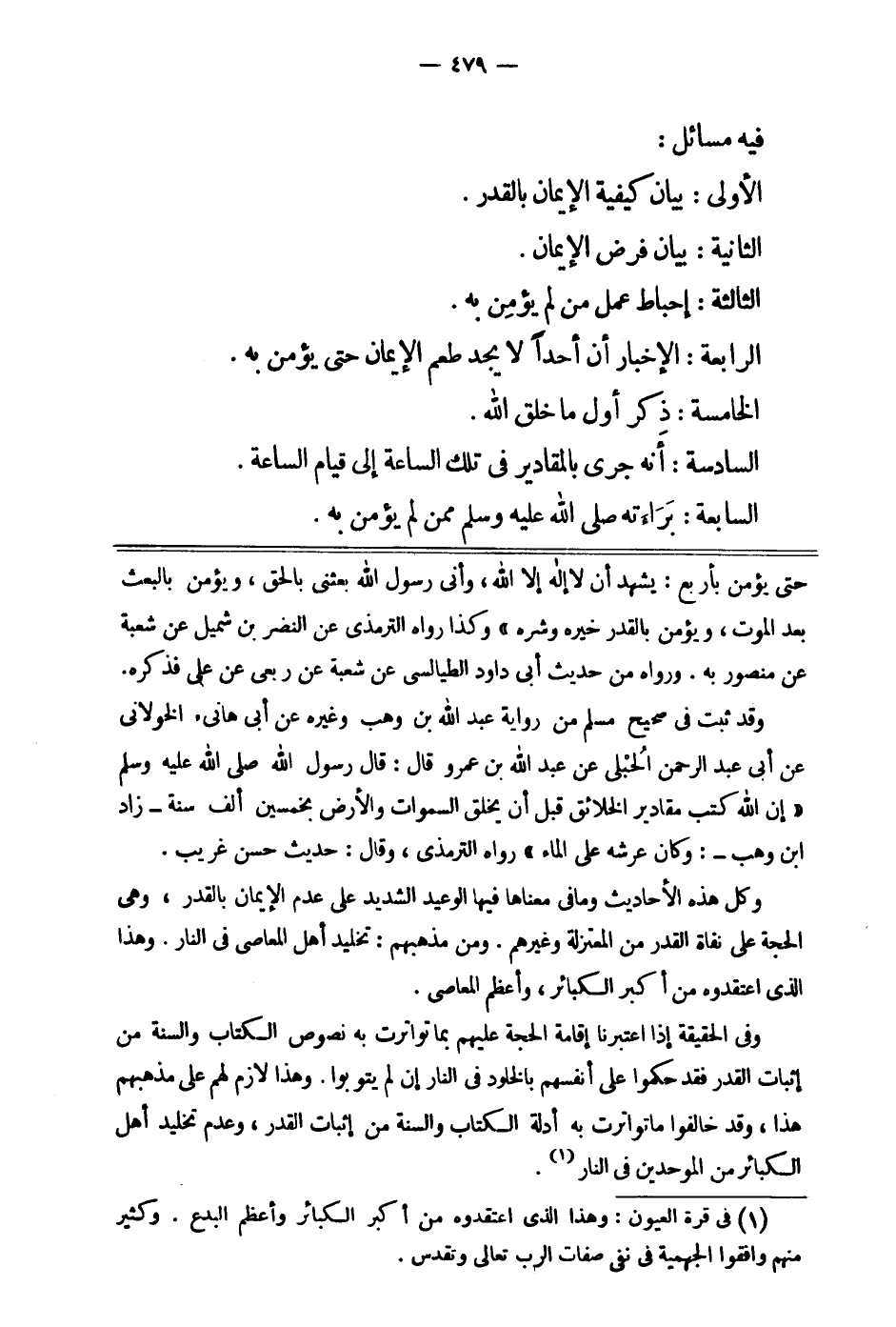 وكل هذه الأحاديث وما في معناها فيها الوعيد الشديد على عدم الإيمان بالقدر، وهي الحجة على نفاة القدر من المعتزلة وغيرهم. ومن مذهبهم: تخليد أهل المعاصي في النار، وهذا الذي اعتقدوه من أكبر الكبائر وأعظم المعاصي. وفي الحقيقة إذا اعتبرنا إقامة الحجة عليهم بما تواترت به نصوص الكتاب والسنة من إثبات القدر، فقد حكموا على أنفسهم بالخلود في النار إن لم يتوبوا. وهذا لازم لهم على مذهبهم هذا، وقد خالفوا ما تواترت به أدلة الكتاب والسنة من إثبات القدر، وعدم تخليد أهل الكبائر من الموحدين في النار5.
