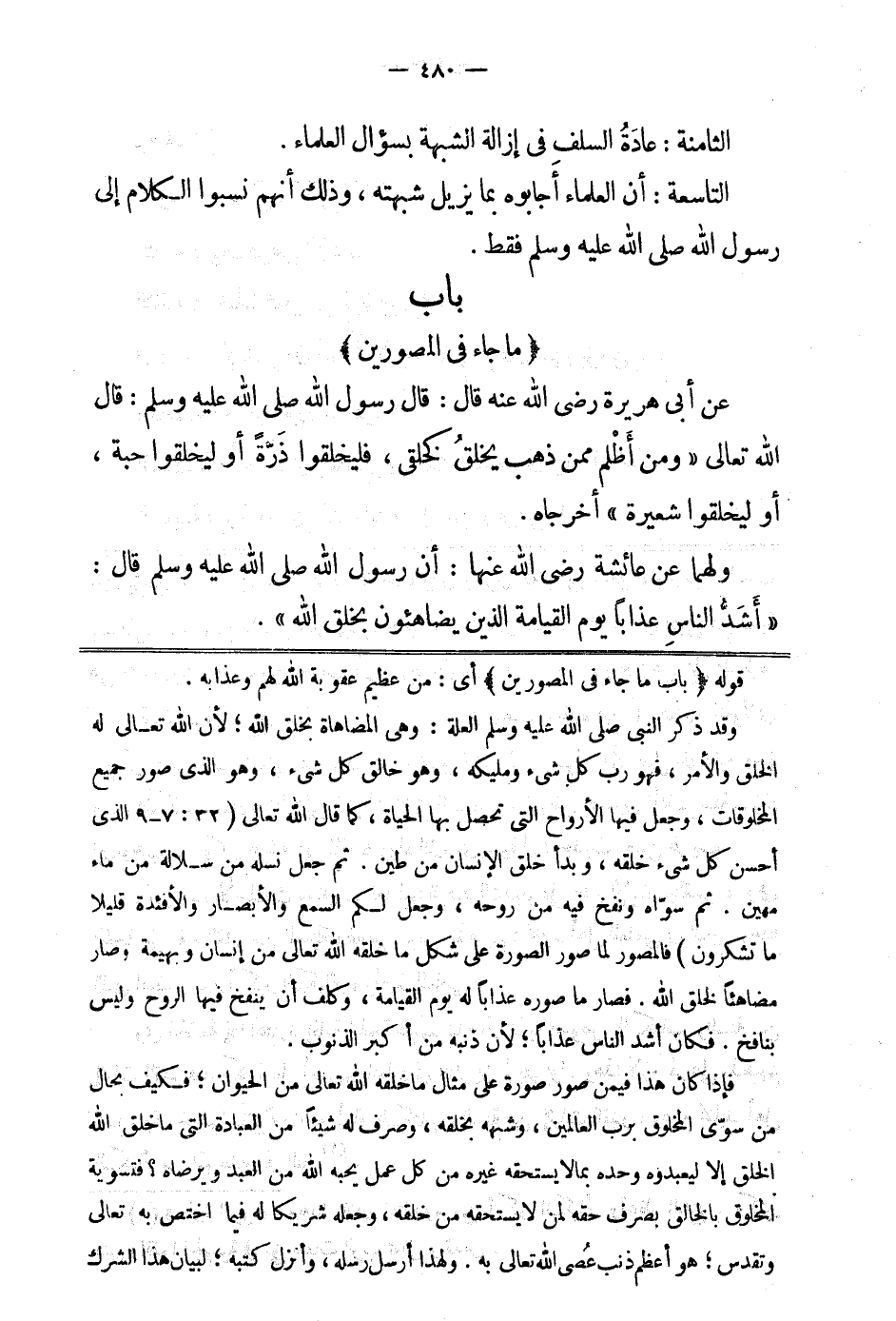 وقد ذكر النبي صلى الله عليه وسلم من العلة: وهي المضاهاة بخلق الله؛ لأن الله تعالى له الخلق والأمر، فهو رب كل شيء ومليكه، وهو خالق كل شيء وهو الذي صور جميع المخلوقات، وجعل فيها الأرواح التي تحصل بها الحياة، كما قال تعالى: {الَّذِي أَحْسَنَ كُلَّ شَيْءٍ خَلَقَهُ وَبَدَأَ خَلْقَ الْأِنْسَانِ مِنْ طِينٍ ثُمَّ جَعَلَ نَسْلَهُ مِنْ سُلالَةٍ مِنْ مَاءٍ مَهِينٍ ثُمَّ سَوَّاهُ وَنَفَخَ فِيهِ مِنْ رُوحِهِ وَجَعَلَ لَكُمُ السَّمْعَ وَالأَبْصَارَ وَالأَفْئِدَةَ قَلِيلاً مَا تَشْكُرُونَ} 5. فالمصور لما صور الصورة على شكل ما خلقه الله تعالى من إنسان وبهيمة صار مضاهئا لخلق الله. فصار ما صوره عذابا له يوم القيامة، وكلف أن ينفخ فيها الروح وليس بنافخ، فكان أشد الناس عذابا; لأن ذنبه من أكبر الذنوب.