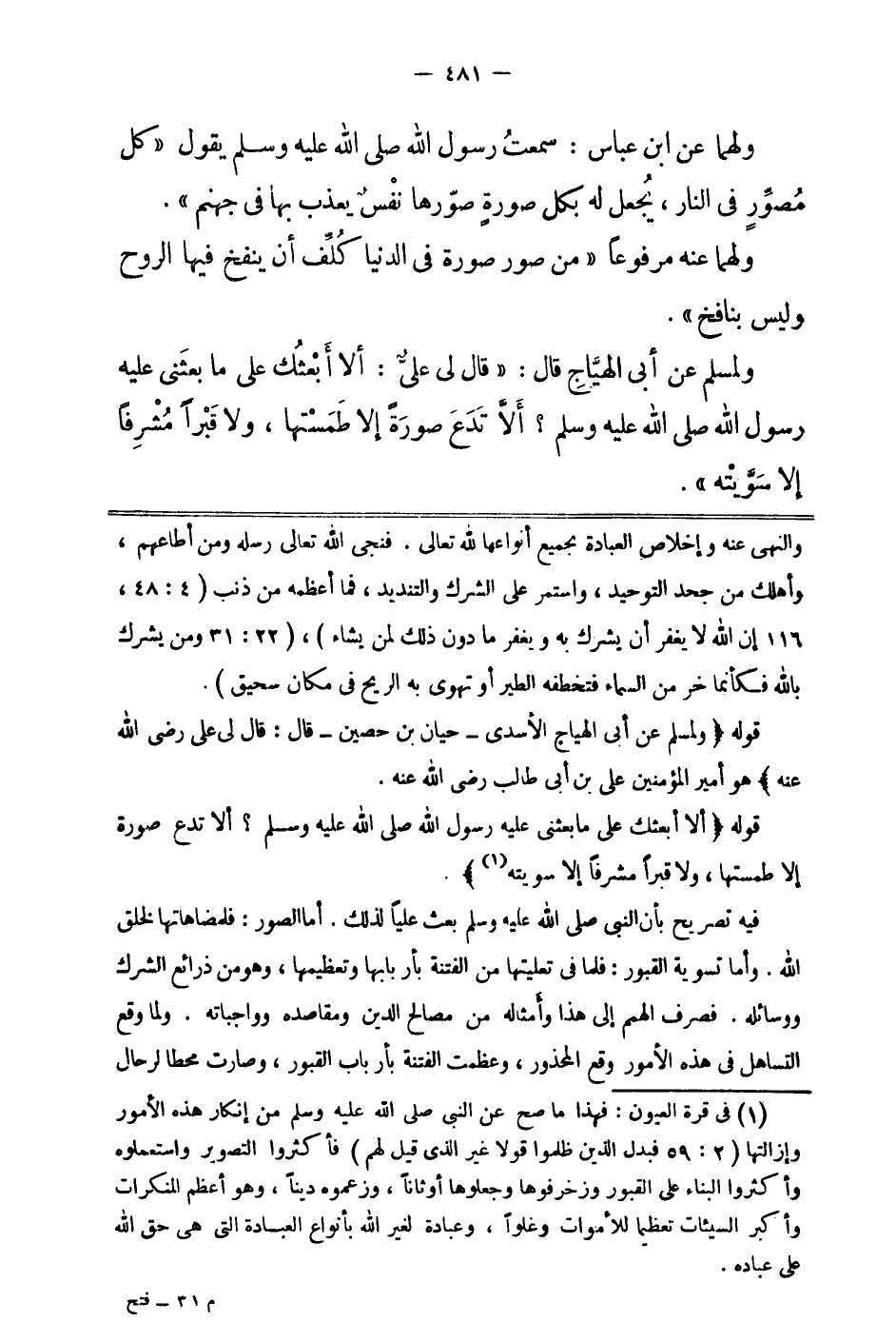 قوله: " " ألا أبعثك على ما بعثني عليه رسول الله صلى الله عليه وسلم؟ أن لا تدع صورة إلا طمستها، ولا قبرا مشرفا إلا سويته "3.