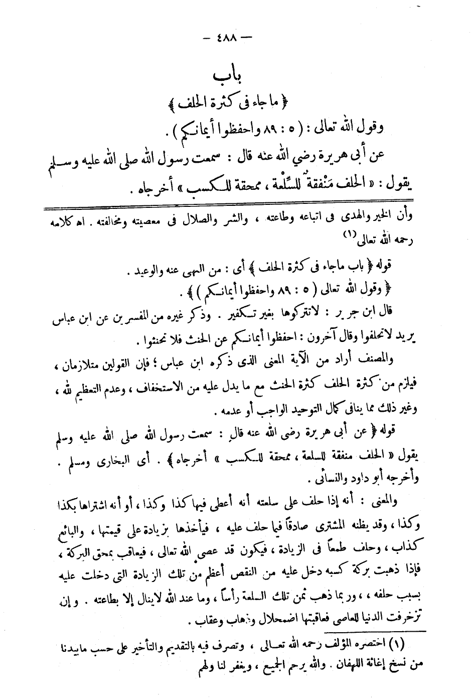 "عن أبي هريرة رضي الله عنه قال: سمعت رسول الله صلى الله عليه وسلم يقول: " الحلف منفقة للسلعة، ممحقة للكسب ". أخرجاه". أي البخاري ومسلم. وأخرجه أبو داود والنسائي. والمعنى: أنه إذا حلف على سلعته أنه أعطي فيها كذا وكذا، أو أنه اشتراها بكذا وكذا، وقد يظنه المشتري صادقا فيما حلف عليه فيأخذها بزيادة على قيمتها، والبائع كذاب وحلف طمعا في الزيادة، فيكون قد عصى الله تعالى، فيعاقب بمحق البركة، فإذا ذهبت بركة كسبه دخل عليه من النقص أعظم من تلك الزيادة التي دخلت عليه بسبب حلفه، وربما ذهب ثمن تلك السلعة رأسا. وما عند الله لا ينال إلا بطاعته، وإن تزخرفت الدنيا للعاصي فعاقبتها اضمحلال وذهاب وعقاب.