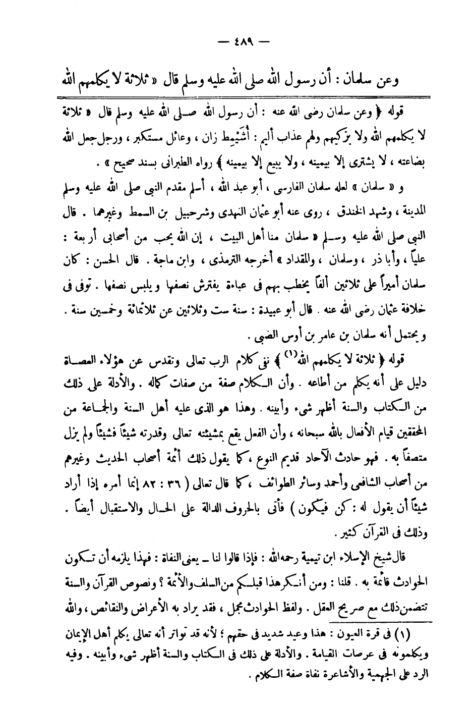 قوله: "ثلاثة لا يكلمهم الله" 3 نفي كلام الرب -تعالى وتقدس- عن هؤلاء